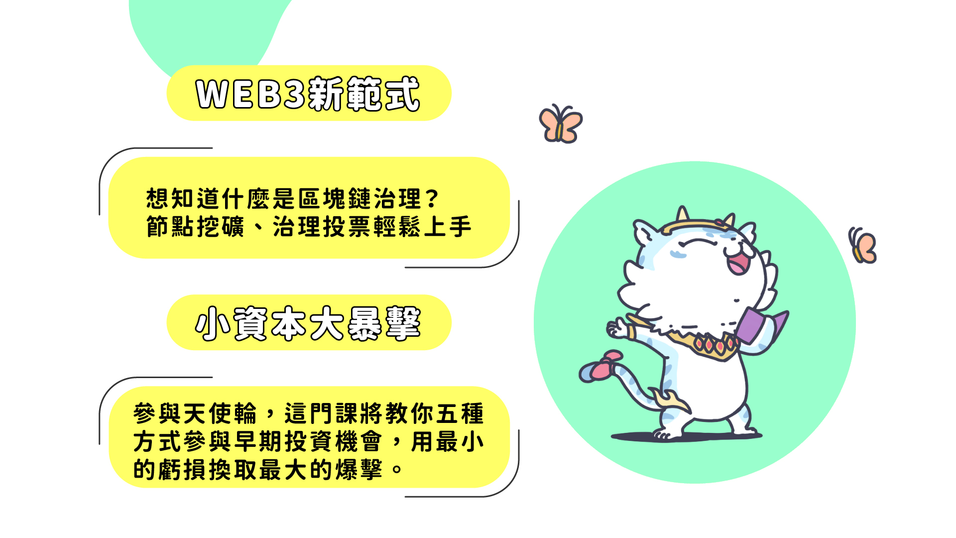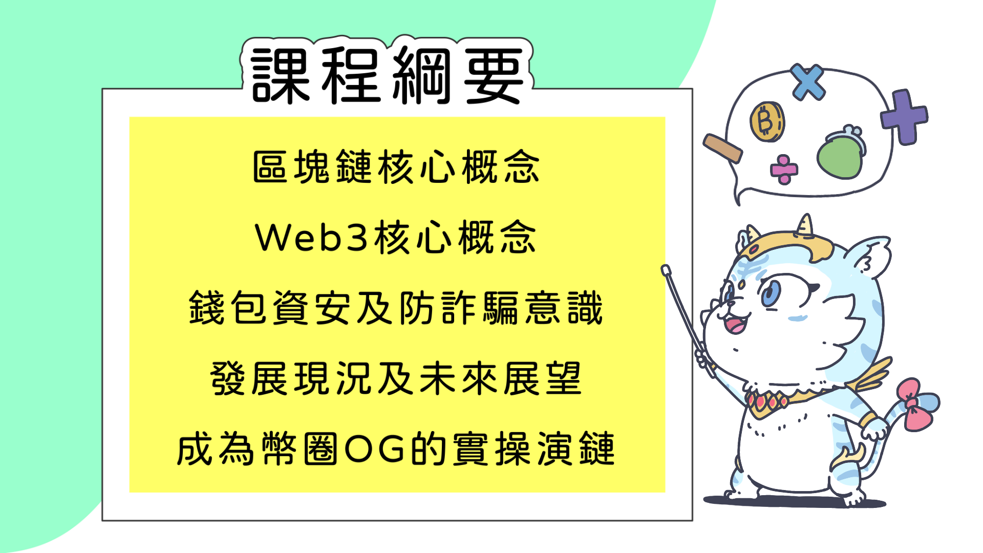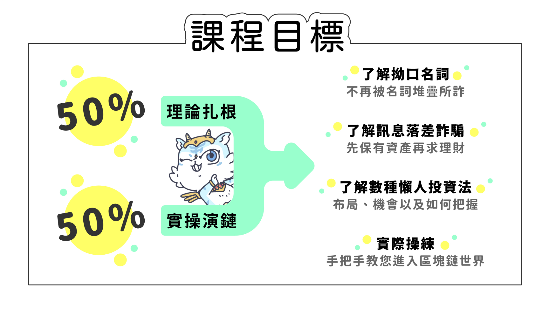 本課程為零基礎新手開立之課程,其藉由淺白易懂的方式引領學員進入Web3和區塊鏈的世界,協助學員掌握新時代的紅利。 於理論面,學員將明白區塊鏈原理及其相關拗口名詞,如:何謂區塊?何來鏈?何謂去中心化金融等等,深入淺出知曉區塊鏈技術的起源及沿革,這些Web3原住民的底層邏輯,並期許引領學員成為Web3新住民,並了解目前區塊鏈發展、應用及其未來展望。 於實操面,學員將學會使用去中心化錢包等鏈上操作,如:創建代幣、創教NFT、創建AMM的LP等等,有效節省學員自行摸索時間,並給予對症下藥的協助。