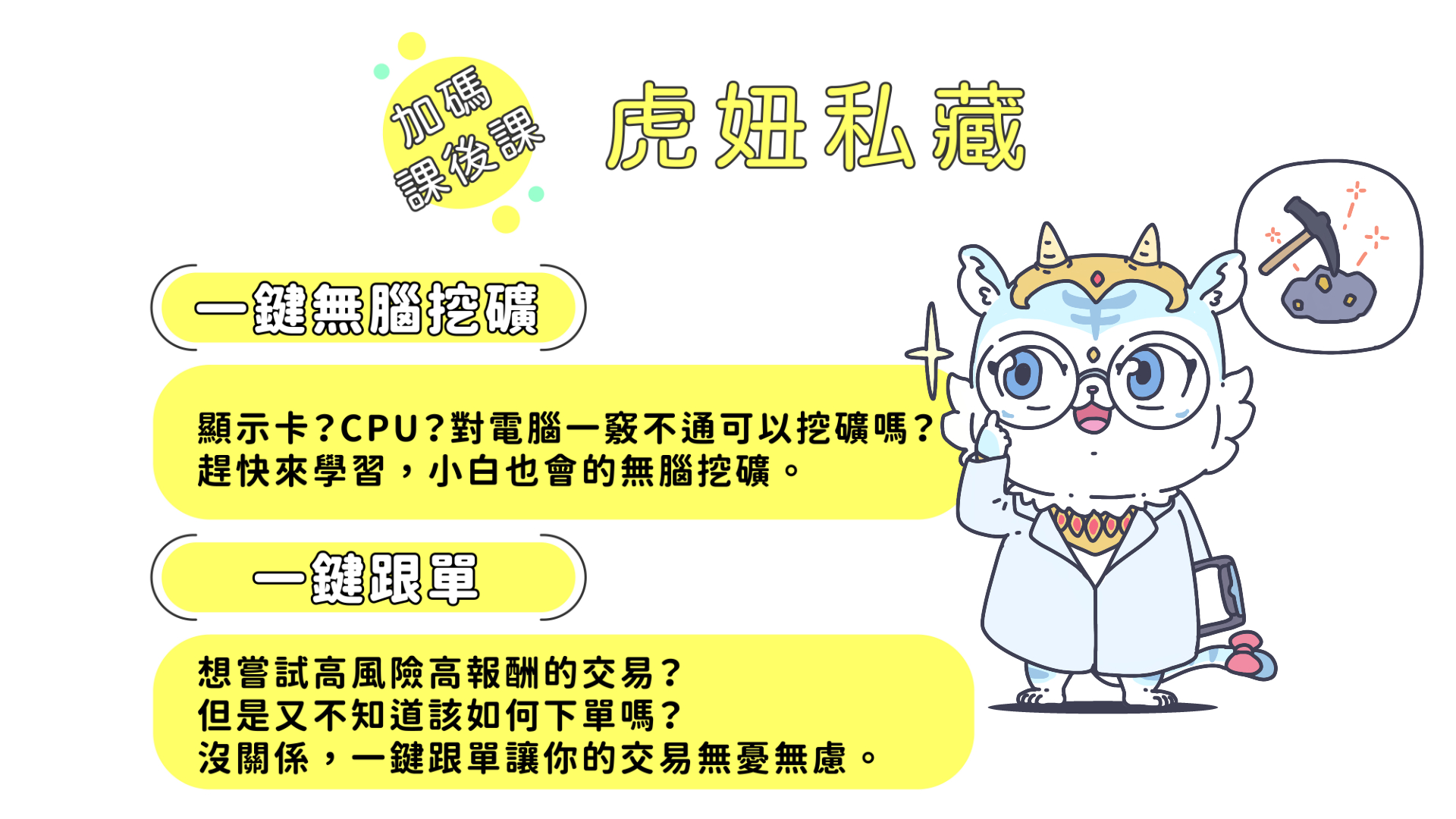 • 終身VIP:特別創立VIP社群,社群將提供更多更新區塊鏈知識及課後問答。學員上完兩天課程,僅是零到一的過程,舒虎教育將陪伴學員從一到十、從十到一百,終身VIP社群將伴隨學員一路成長。