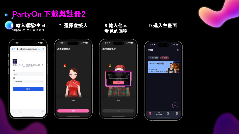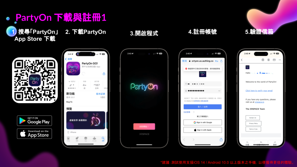 全程採線上參加,使用自己的手機/平板電腦即可完成比賽及參與。(至「App Store」或「Google Play」 下載「PartyOn」app)