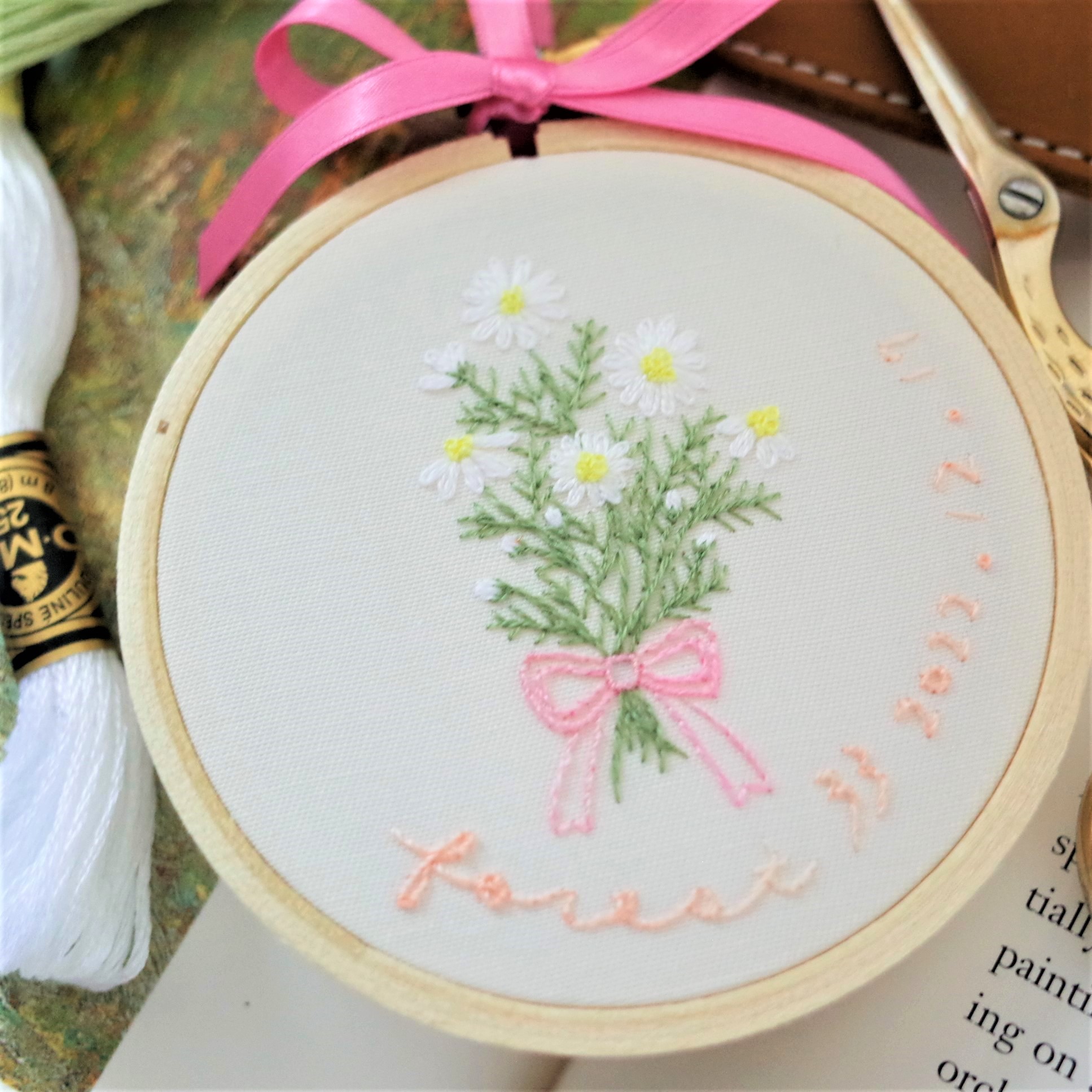 ★收布邊,綁緞帶,完成雛菊刺繡框掛飾