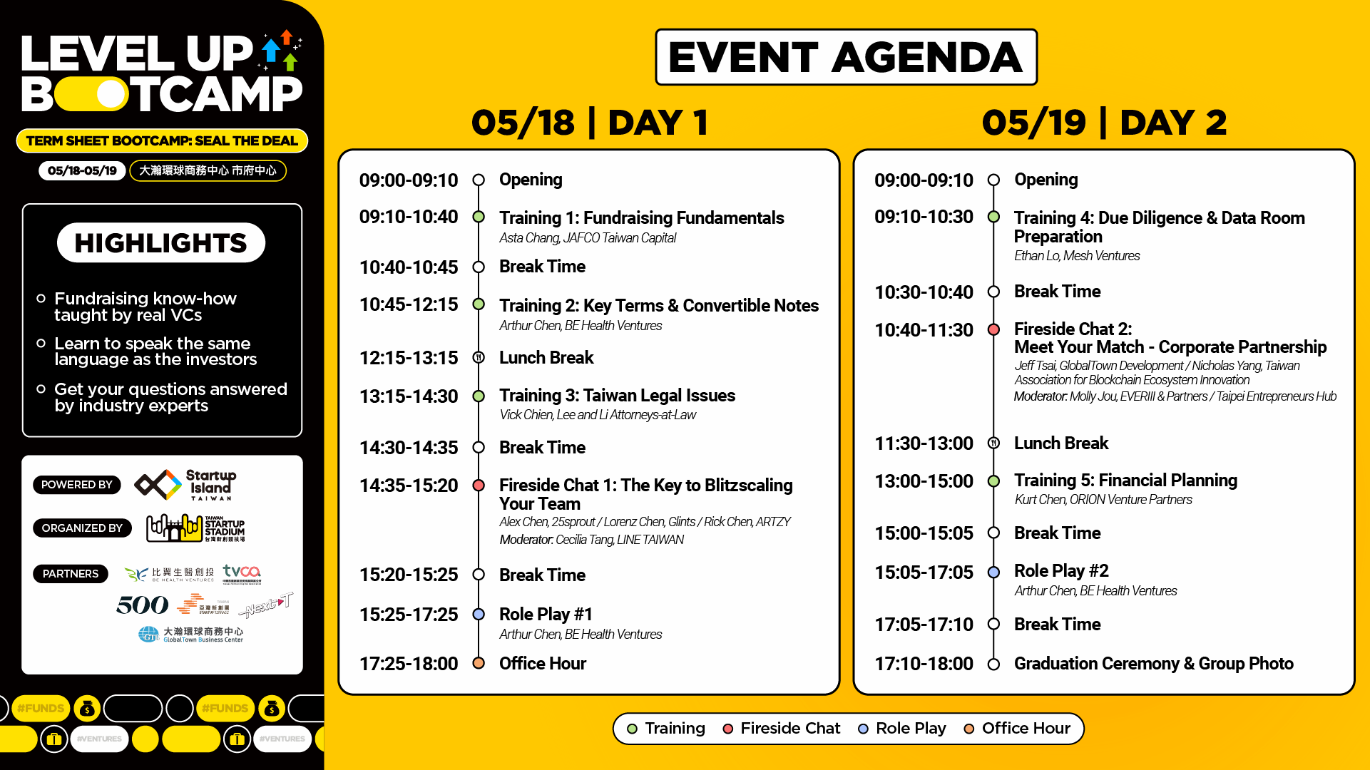 訓練營將分成培訓課程、爐邊會談、角色扮演等三種課程,搭配與投資人面對面的1對1導師時間,由投資人親身指導,手把手教會新創團隊寫出讓 VC 買單的投資條件書。透過本訓練營,新創團隊也將獲得與潛在投資人建立人脈的機會,進一步達成募資目標,並和來自各個領域的新創團隊交流。