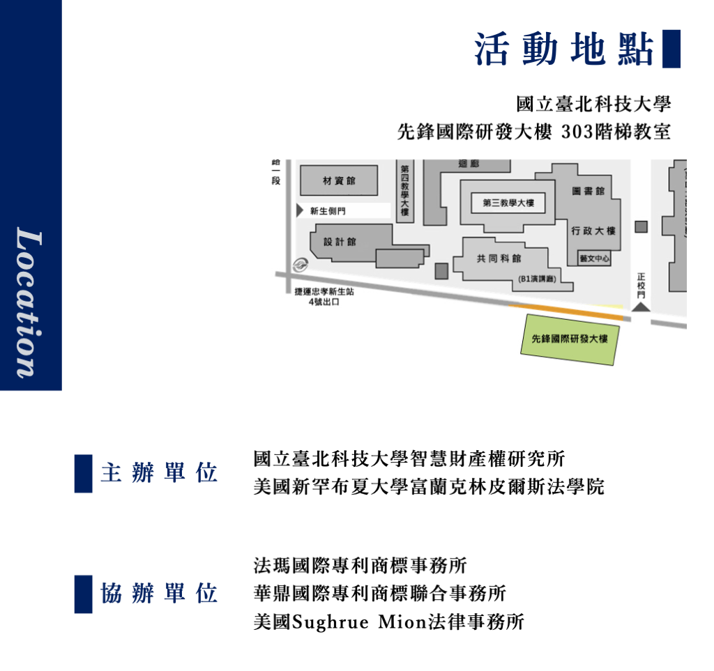 國立臺北科技大學先鋒國際研發大樓(位於校門口對面,無需進入校園)303階梯教室