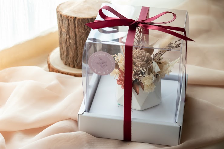 作品完成後,我們會附上提袋,若想要送禮更加精緻,也可以考慮加購禮盒包裝(+100元),我們的包裝禮盒選用了小蛋糕盒,看起來精巧細緻,緞帶也是特別選用與盆花色系相同的緞帶,使得整體視覺更加完整。