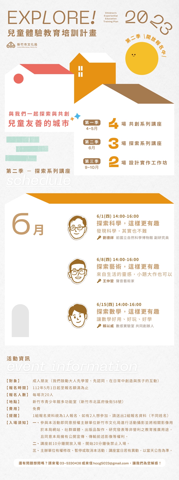 《Explore!兒童體驗教育培訓計畫》規劃4場共創系列講座、3場探索系列講座、2場設計實作工作坊。