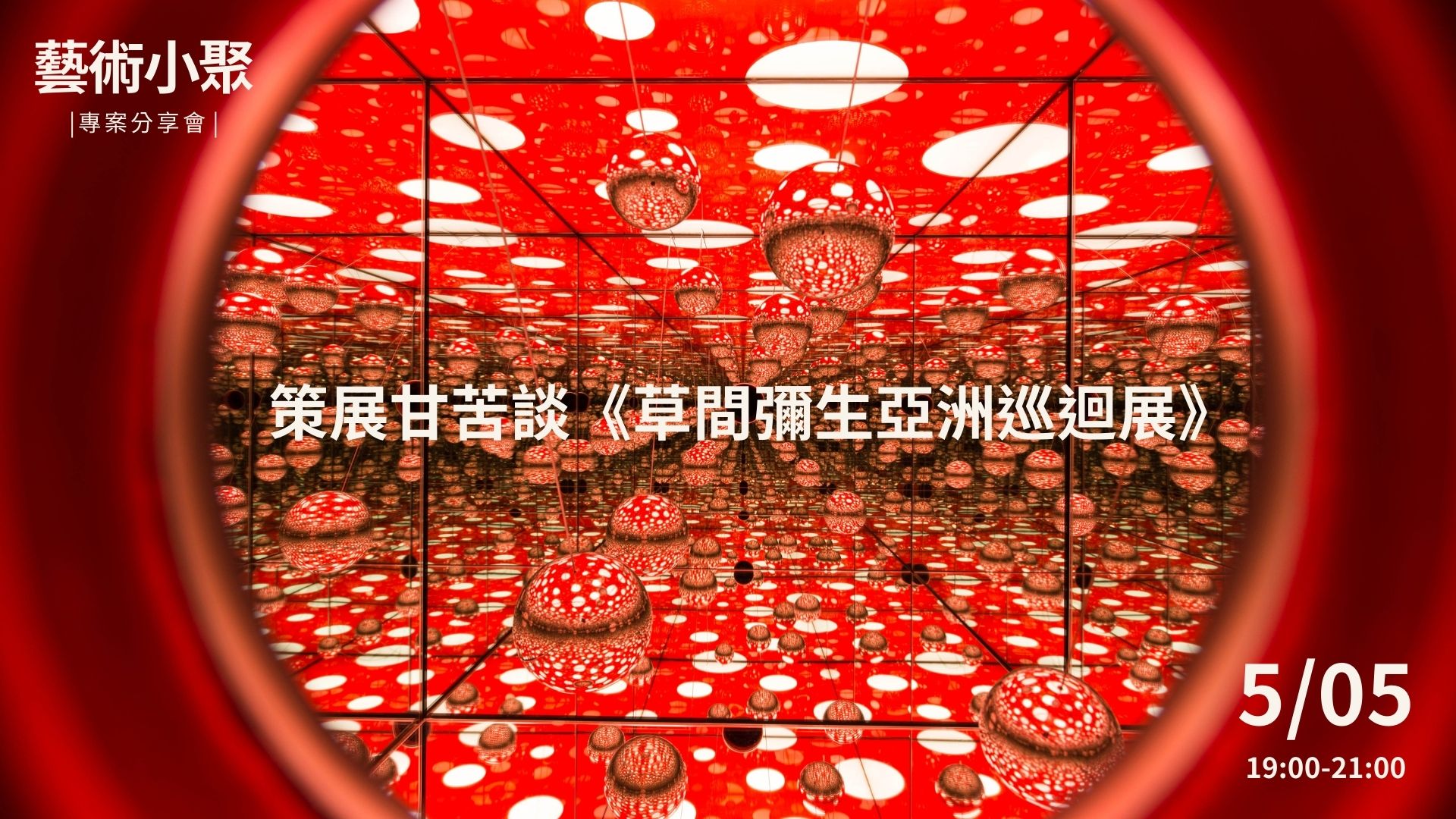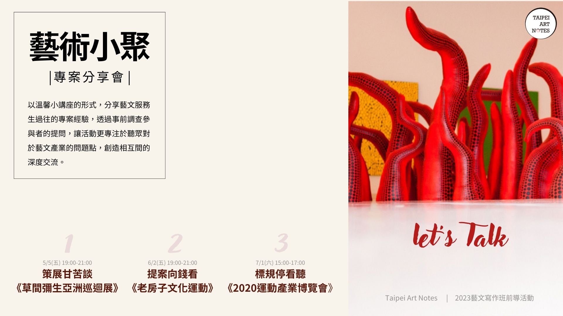 以溫馨小講座的形式,分享藝文服務生過往的專案經驗,活動專注於聽眾對於藝文產業的問題點,創造相互間的深度交流。《草間彌生亞洲巡迴展台灣站》專案分享會內容包含:國際展演洽談、國際運輸與佈展、台灣美術館合作、票務與現場執行、文創商品開發、贊助與行銷活動等面向。