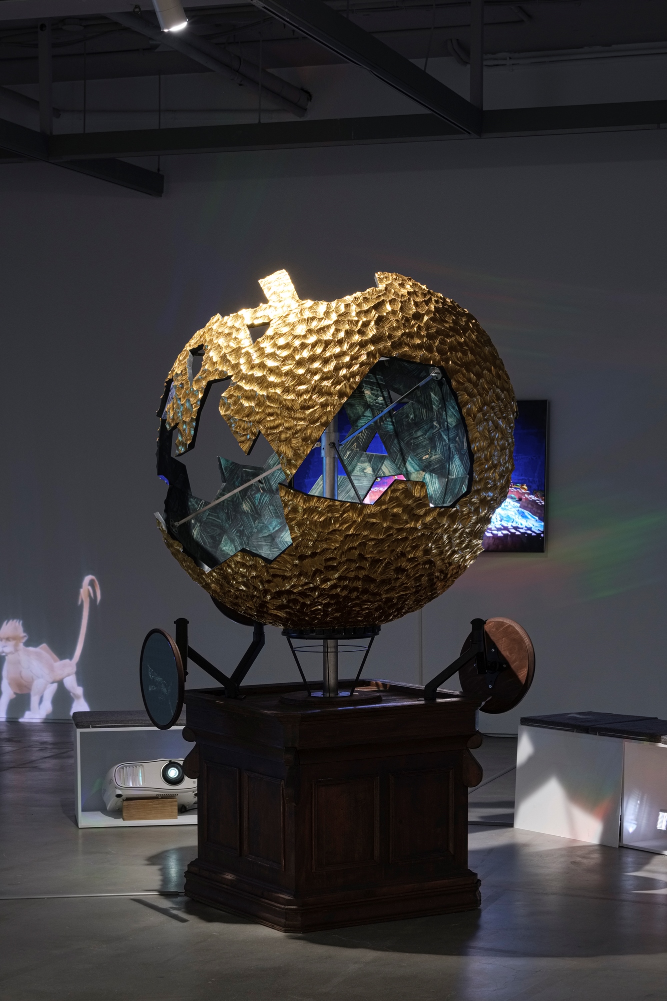 邱杰森、莫珊嵐,〈海景〉,2022,日本檜木、金箔、油性漆、動力裝置、矽晶圓、錄像裝置,球體直徑 120cm其他依場地而定。