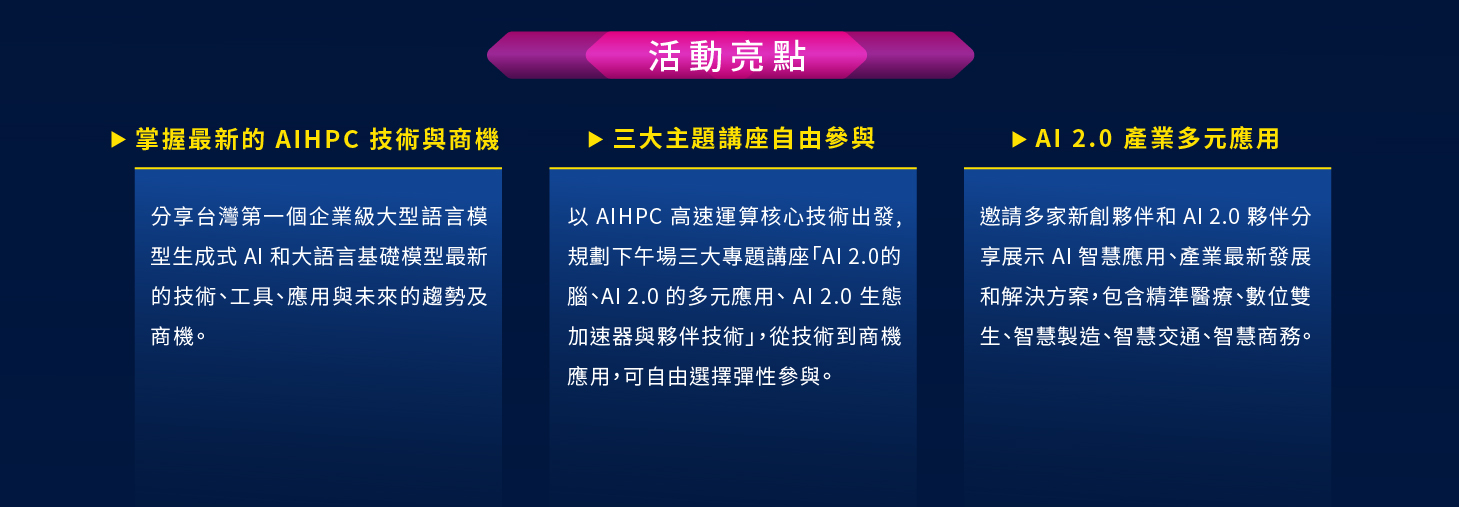 台智雲舉辦一年一度的科技盛會「AIHPCcon 台灣 AI 超算年會」,今年以「AI 2.0 · 超算 · 新生態」為主軸, 搶先發布台灣第一個企業級大型語言模型的技術與全新的商業模式,並邀請AI 2.0 夥伴分享產業趨勢和應用,帶您深入了解分享台灣最強大的 AI 超級電腦雲服務技術量能與生態圈資源,創造可信賴的AI 2.0未來機會,並加速產業 AI 智慧應用創新、快速掌握 AI 數位商機發展趨勢。