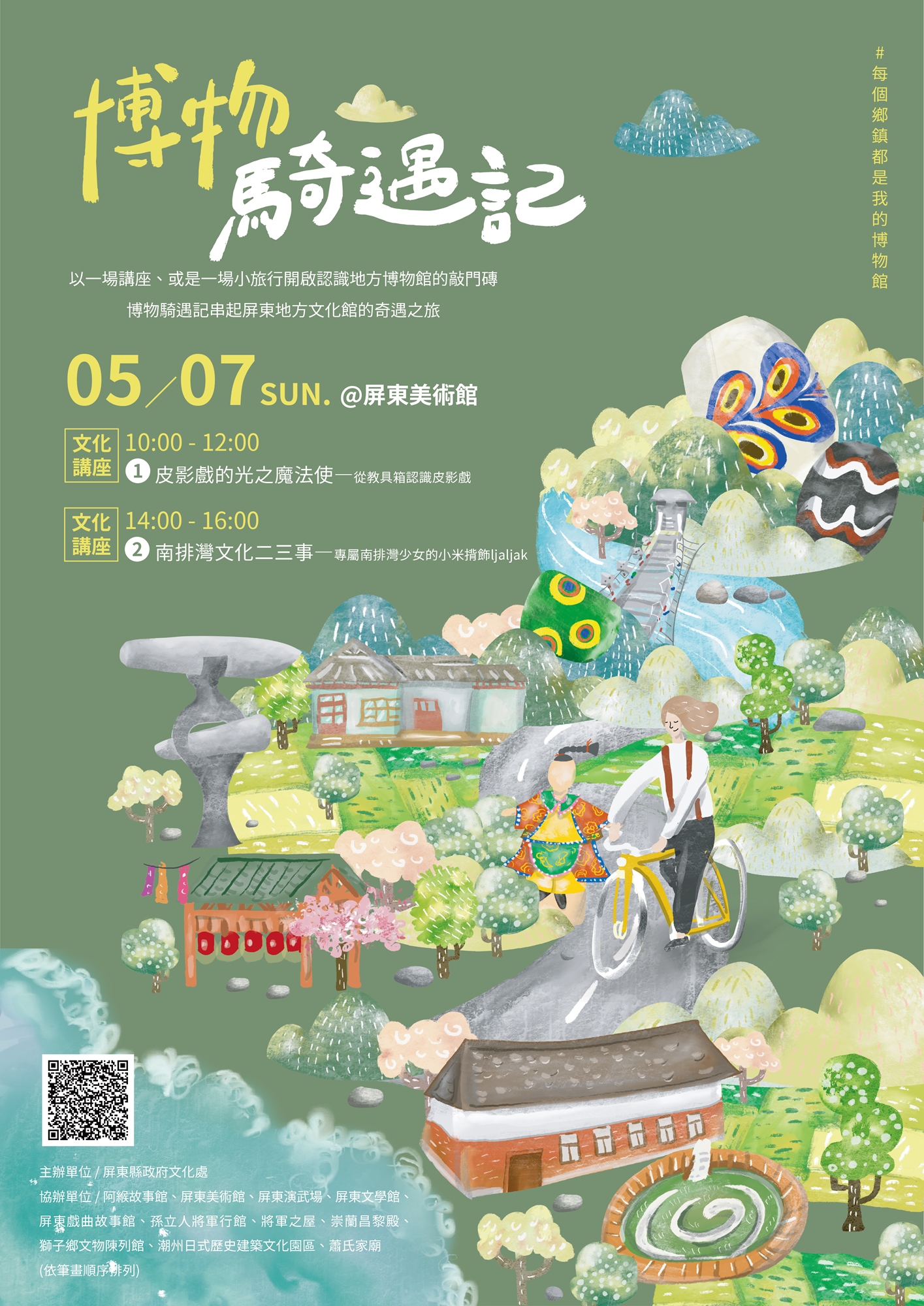 5/18是一年一度的國際博物館日,今年度屏東縣政府以博物騎遇記為博物館日主題,結合低碳環保永續精神,以自行車串連屏東地方文化館,打開認識地方文化的敲門磚,創造在地文化觀光之旅。屏東騎遇記系列活動包含文化講座以及文化旅讀,民眾可以選擇透過一場講座、或是一場小旅行,深入貼近屏東地方文化館。