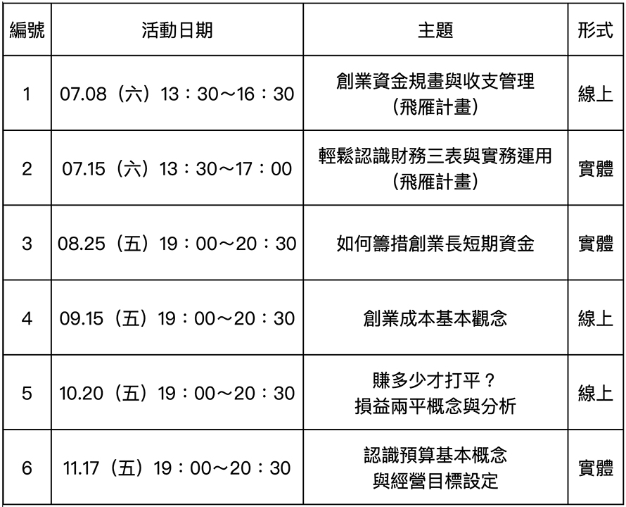 這些年下來,有感於不少創業者對於財務課題的忽略或知能不足,讓我們今年度有專注在創業者的財務課題念頭,未來也計畫更深耕於創業者的財務議題上,今年度系列主題規劃如下,期盼提升創業家的財務敏感度與知能,減少創業過程的財務風險,發揮資金最大效益,健全事業體質。