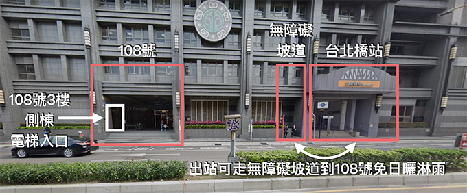 路線:捷運台北橋站,單一出口,出站右手邊大樓側動電梯,如下圖示