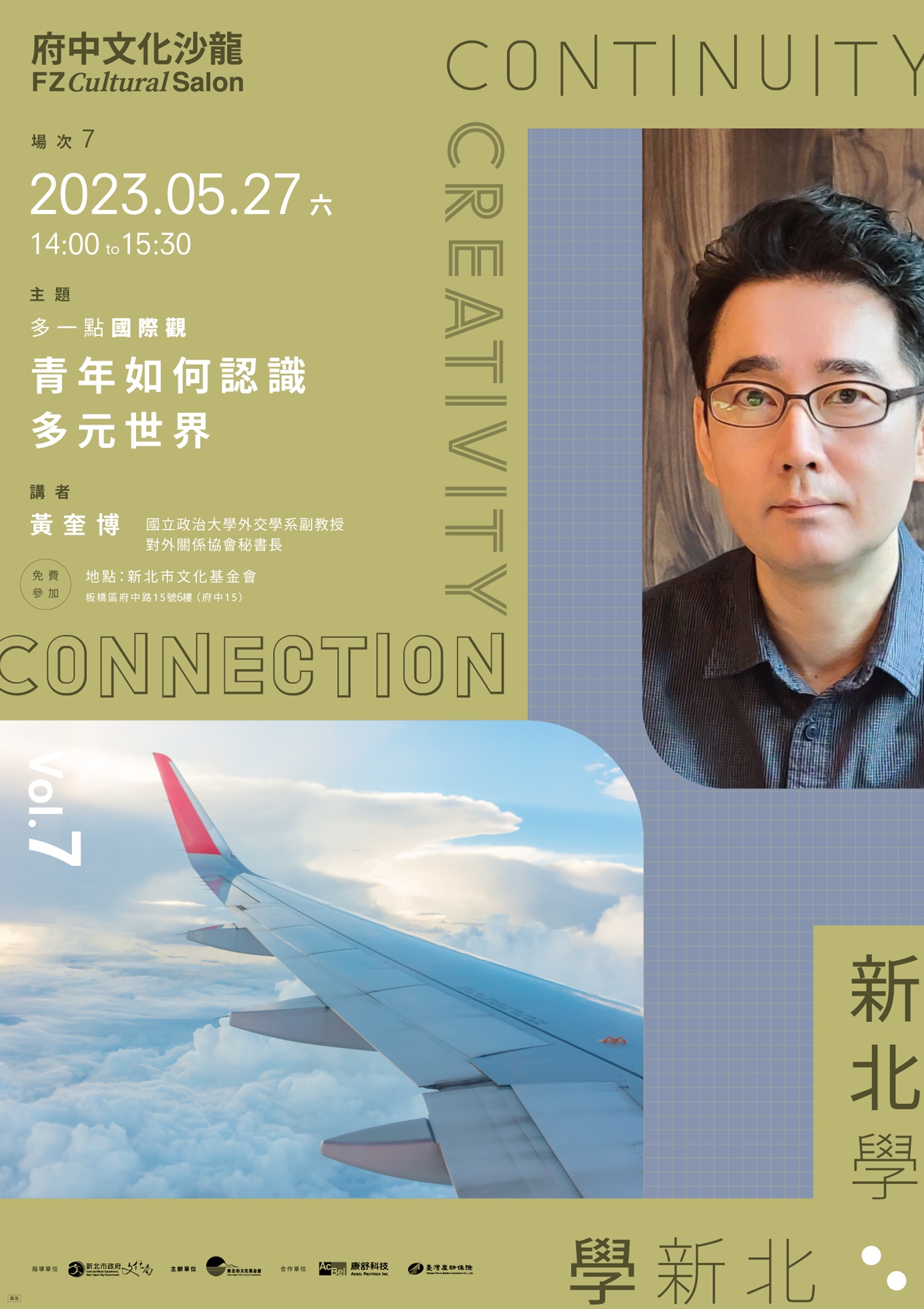 2023府中文化沙龍第7場,由知名的外交學者黃奎博副教授主講,將以最深入淺出的方式,分享青年如何善用公部門(學校)資源、網路和媒體識讀培養多元的國際視角,進而塑造國際觀。