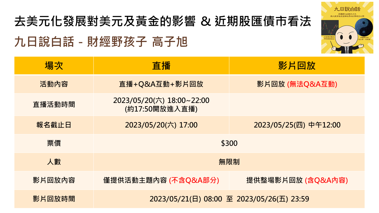 過去美國前財政部長康利曾說道:『美元是我們的貨幣,卻是你們的問題』,而從2022年起全球開始行動解決這樣的問題。這將對美元以及黃金的趨勢帶來什麼影響,九日將會在當天做主題式探討。