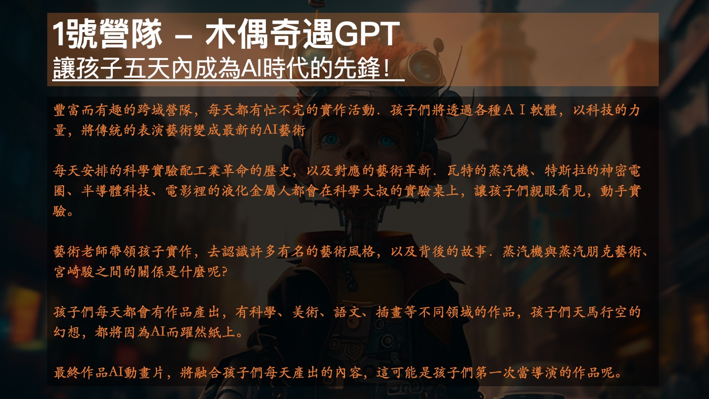 【木偶奇遇GPT】營隊將成為孩子們暑假中最難忘的一個營隊,千萬別錯過【木偶奇遇GPT】這場跨越時空的奇幻之旅。🌟