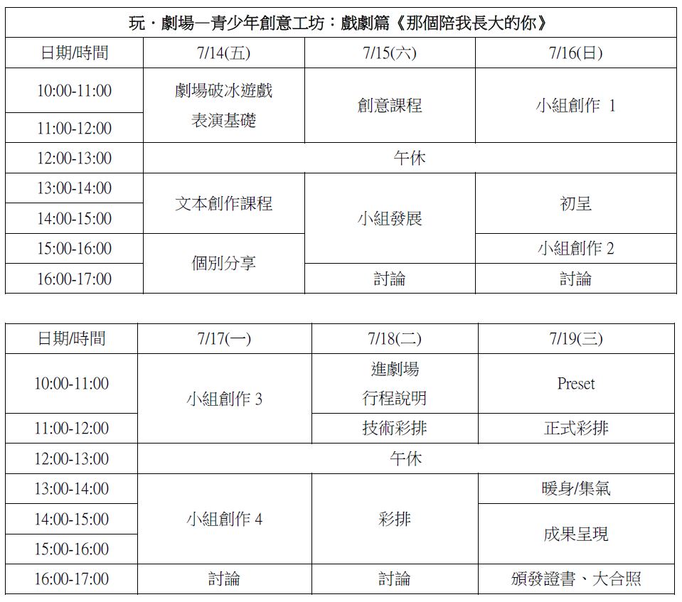 本次工作坊以紀錄劇場為創作方式,歡迎高中同學參與,團隊規劃「創意課程」與「排練創作」兩大方向,以「我」為出發點,「重要物件、重要角色」為發想途徑。課程自破冰活動展開,打開身體感官,認識彼此,透過學員們一同玩樂,體驗表演的樂趣,並藉由分享信件及物品的方式,在過程中慢慢地讓「自己」被大家看見,為接下來的創作準備。工作坊由講師帶領學員們進入表演藝術的世界,用自身的故事,打造一齣屬於青少年的劇場作品。