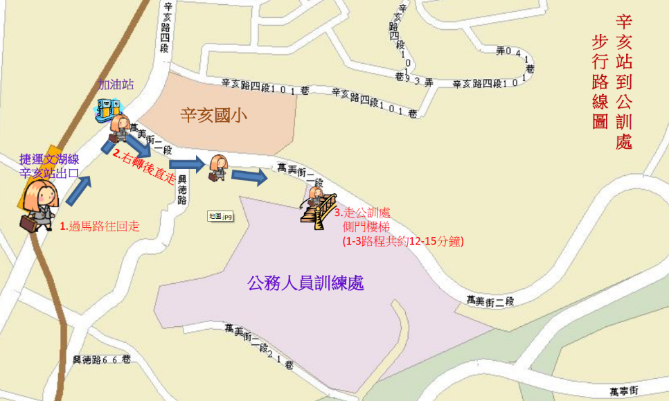 ※課程地點為臺北市政府公務人員訓練處-韻律教室,搭乘大眾交通工具者可以搭乘捷運至辛亥站,出站後過辛亥路,左轉(往辛亥國小方向)沿告示牌步行至本處側門約10-15分鐘即可抵達。