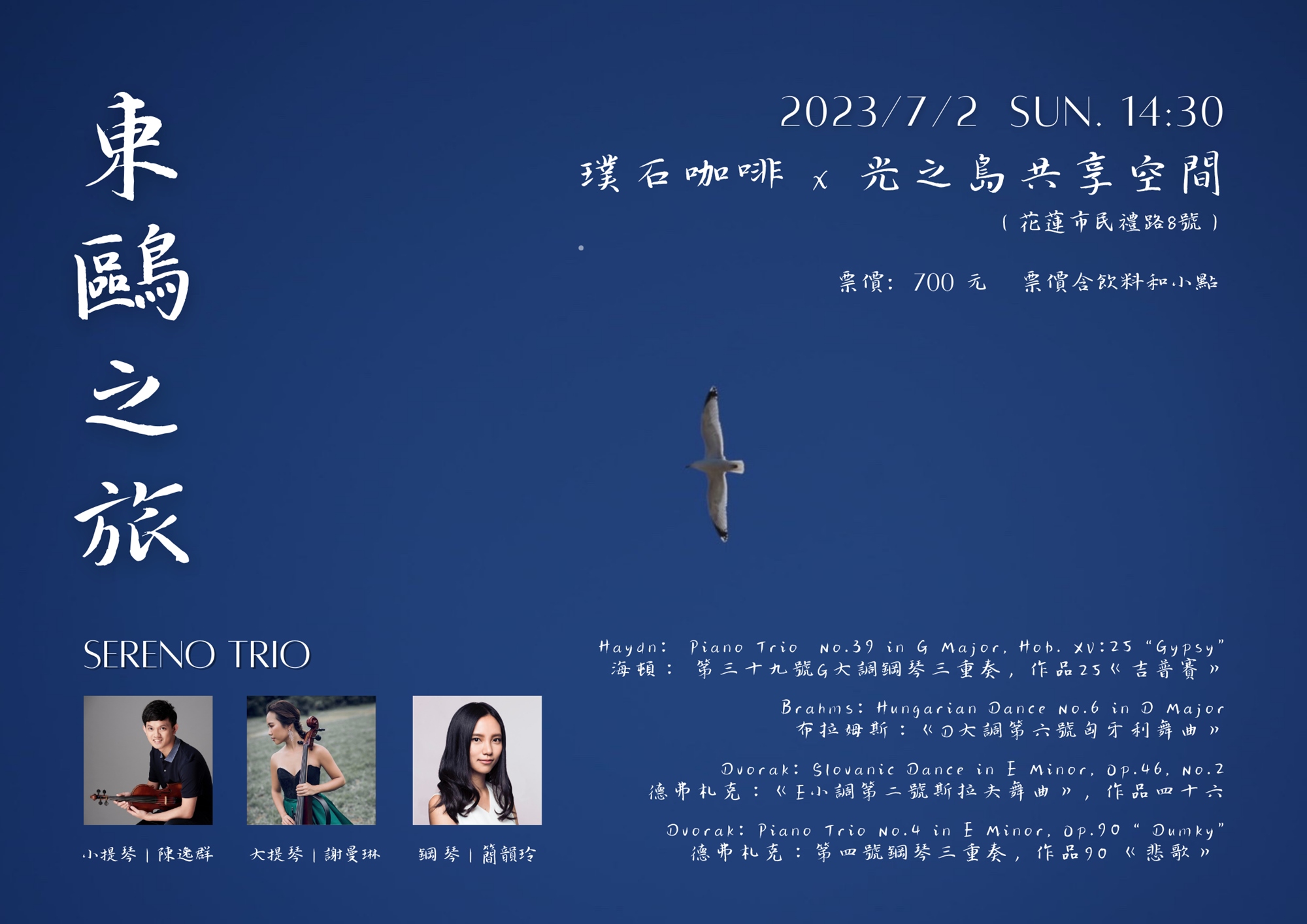 Sereno Trio 從台北場啟程,海鷗象徵著三位熱愛自由的成員,飛往風光明媚的國境之東,降落在花蓮,以音樂帶著聽眾翱翔到遠方的東歐,帶來充滿著東歐舞蹈、及人文風情的音樂。
