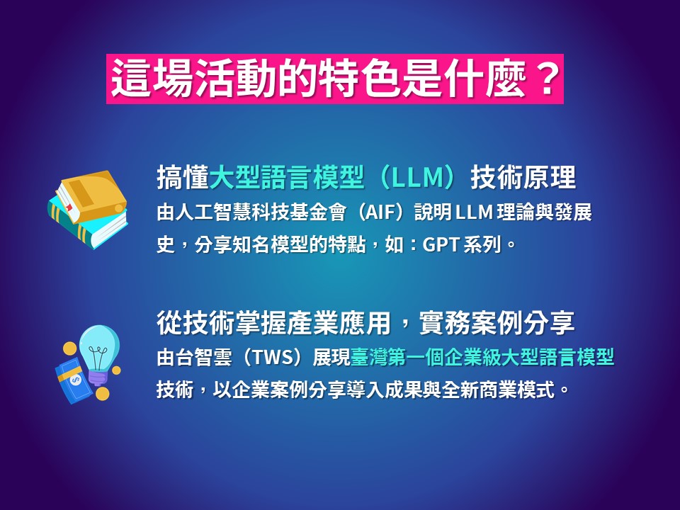 台智雲發布台灣第一個企業級大型語言模型的技術與全新的商業模式,讓企業可以安心用自己產業資料來微調出行業領域知識的基礎模型,微調後的推論則可仰賴台智雲可信賴、節能且可自由遷移部署公有雲、私有雲之間的解決方案,使企業掌握高彈性、安全、高效的生成式AI。此外,也會介紹 AI Factory加速器計畫和 AI 2.0生態圈資源,創造 AI 2.0 未來機會,並加速產業 AI 智慧應用創新、快速掌握 AI 數位商機發展趨勢。