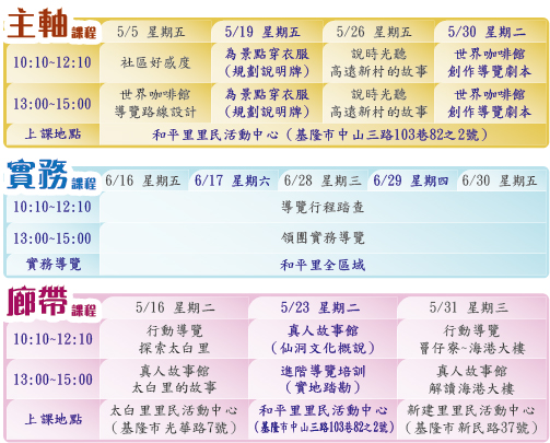 課程內容以和平里文史旅行為主軸,延伸文史知識包含海港大樓、仙洞里及太白里的廊帶文史知識,聘請在地導覽經驗的老師及基隆學研究考據老師分享導覽解說、探尋地方文史之訣竅,再以實地走訪廊帶區域或文史景點,加強培訓人員臨場的實務經驗。