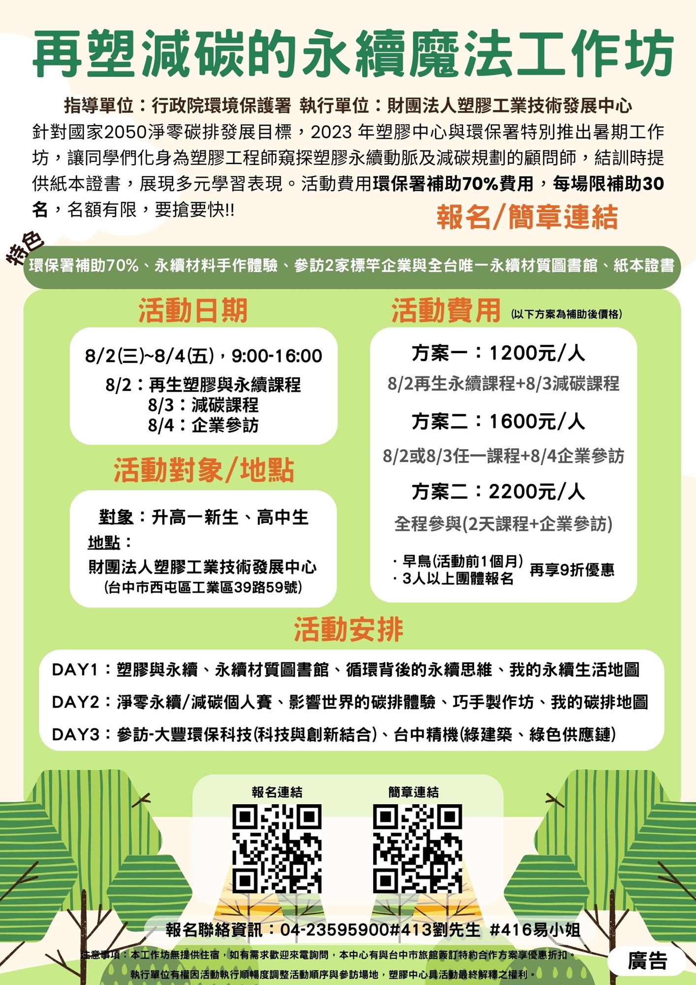 方案1:8/2再生塑膠與永續課程+8/3減碳課程:$1,200元/人(含講義及餐點)