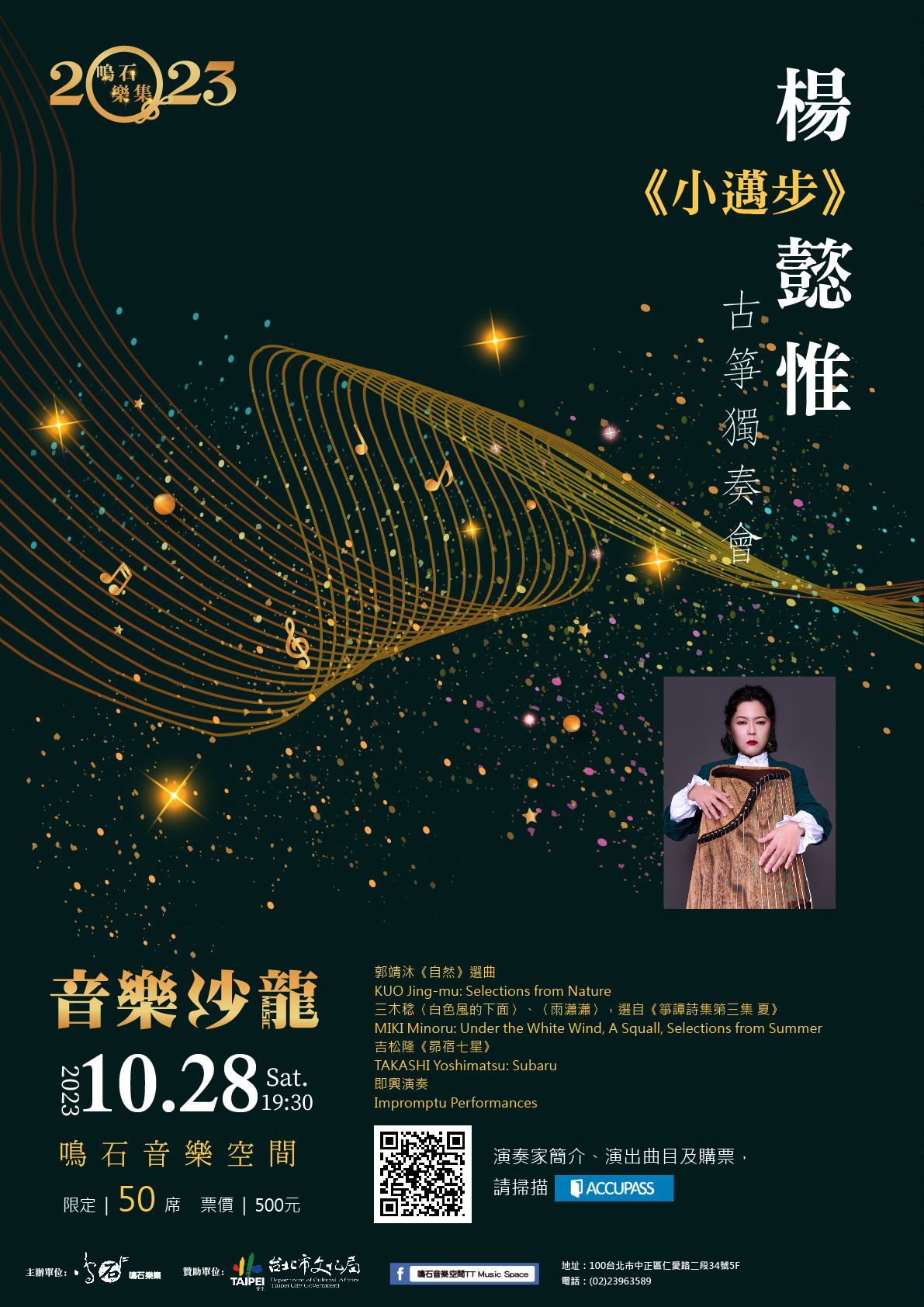 三首當代作曲家作品、多段即興演奏,古箏演奏家楊懿惟延續2022年獨奏會《有時平視,有時俯視》關於山、關於自然主題的探索及追尋,《小邁步》將接觸自然景物時的各種外在環境與內在心理變化,進行了更深層的呼應。本場演出之視角轉向以旋律取向豐富、調性色彩鮮明的多首七聲音階樂曲為主,內容橫亙了明媚的山谷丘壑乃至浩瀚的星辰宇宙,除了題材選擇同樣以自然相關樂曲為軸線,同時也藉由個人接觸山水的經驗加以分享近年爬山時的各種心境轉變,持續在不同尺度、不同視角的藝術觀照中探索更為廣闊的音樂樣貌。