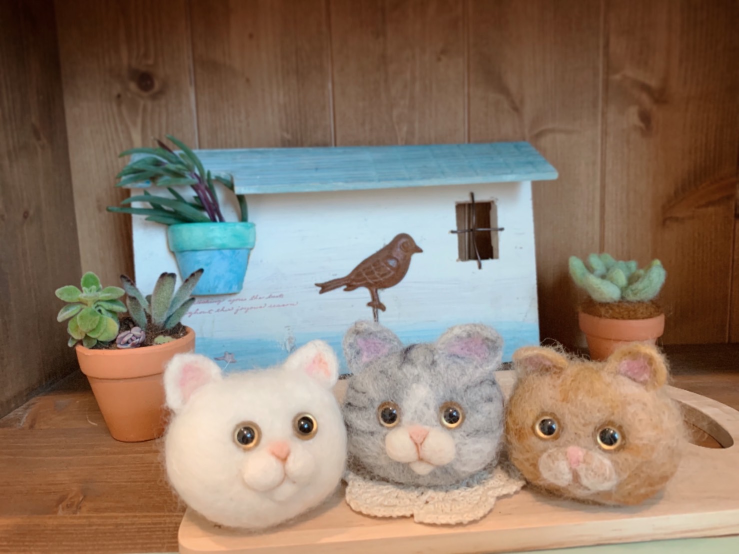 費用|1000 / 人 (包含材料-各色羊毛(顏色可以挑款,顏色:白/棕/灰,報名後可選顏色)/工具- 戳針、工作墊、配件-貓咪眼珠、鑰匙圈或別針(擇一)、包裝紙袋跟透明袋)