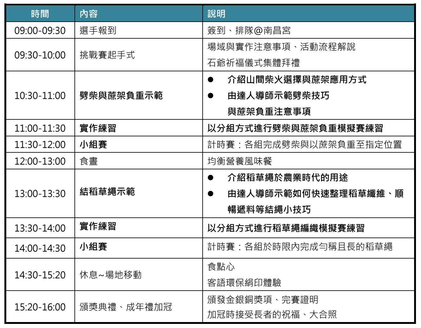 1. 包含「劈柴負重計時賽」與「結草繩計時賽」,採取積分制,優勝隊伍將獲得競賽獎學金。