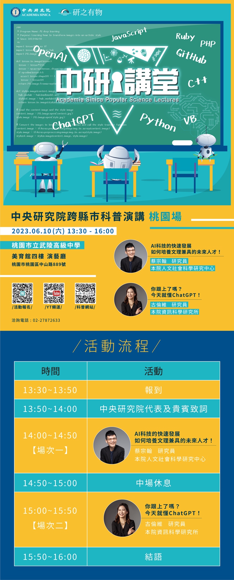 中央研究院為我國最高學術研究單位,為推廣科普知識,自2018年起舉辦「中研講堂」,向臺灣各地民眾分享本院近年重要研究成果,推廣科學知識與基礎研究的意義,已於臺南、花蓮、臺中、屏東、彰化、嘉義、臺東、宜蘭與金門舉辦,獲得廣大迴響。2023年第一站將前往桃園,從資訊與人文的角度分享AI科技的應用與未來願景。