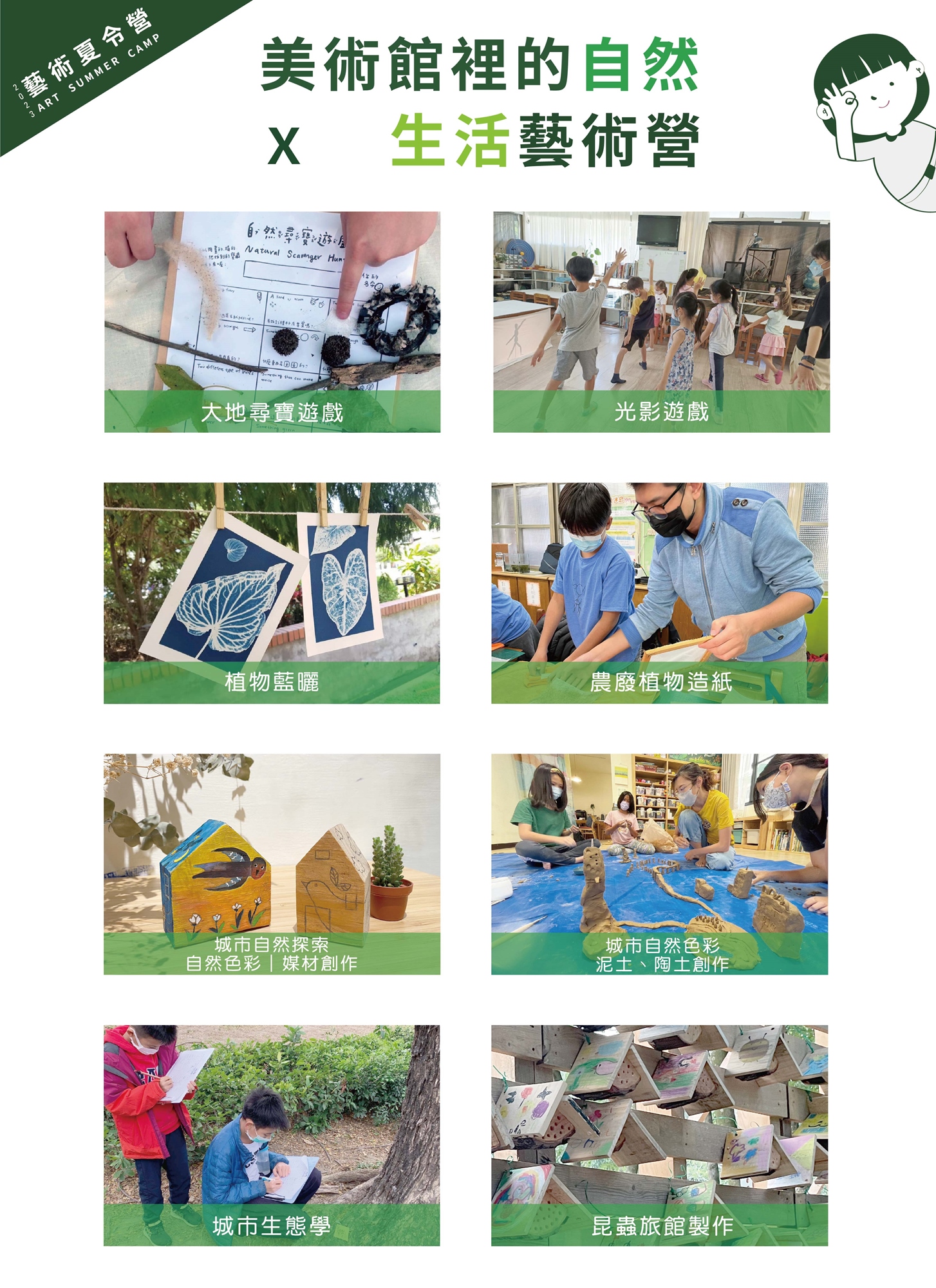 2023年臺南市美術館系列藝術夏令營之一「美術館裡的自然X生活藝術營」,將以「城市自然探索」X「五感生活體驗」X「生活科學」為主題,連結當期展覽〈跨入風景—劃地起造的自然〉中,讓小朋友瞭解藝術家如何思考人與自然所產生的關係,紀錄下社會中不斷變更的風景與自然環境。