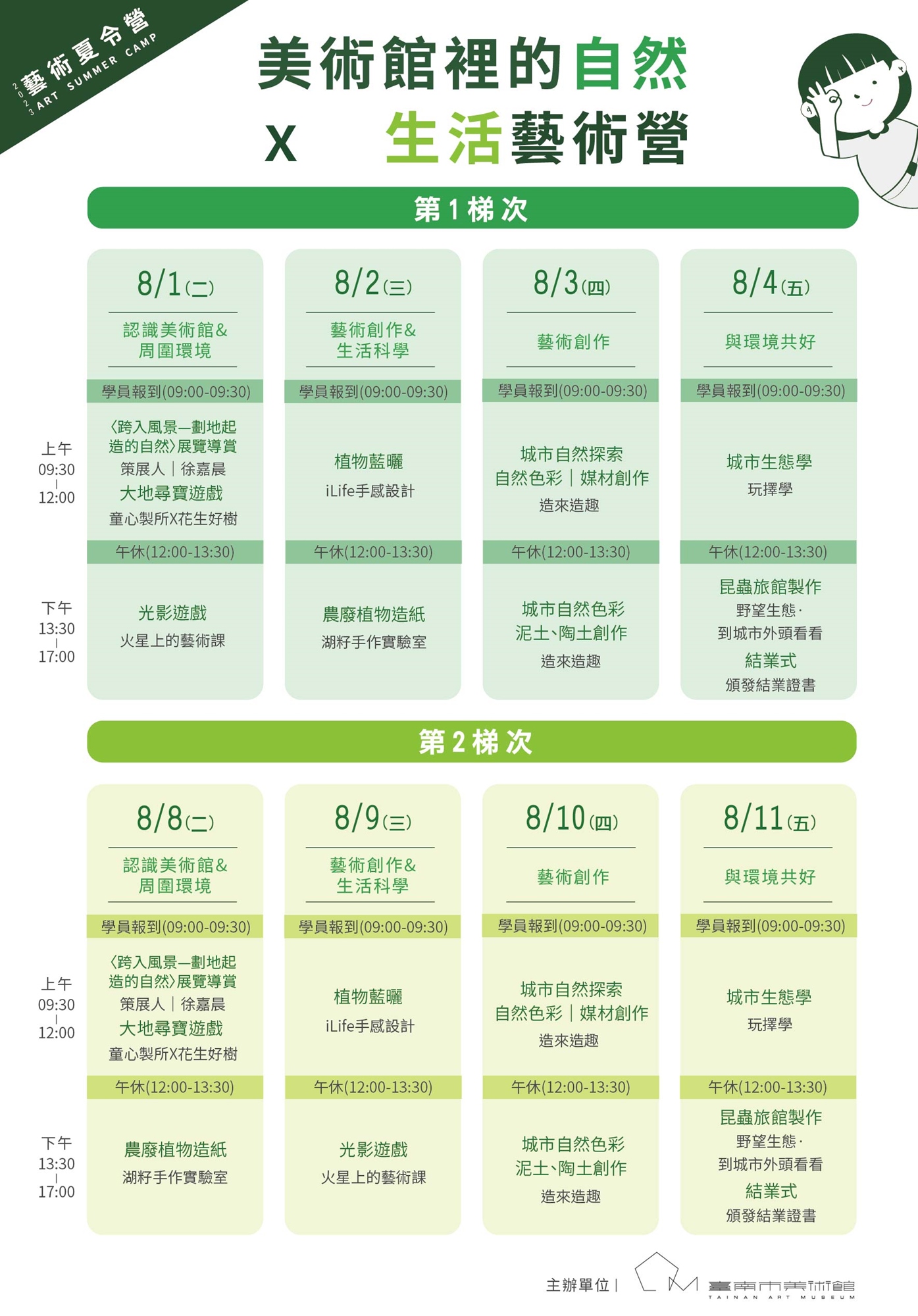 活動中也將結合美術館周圍的自然環境、建築光影、植物媒材創作、生活科學等豐富的跨學科領域,讓小朋友和我們一起在四天的課程裡,探索城市中的綠地風景,以及學習如何從生活中的素材體驗創作的樂趣 !