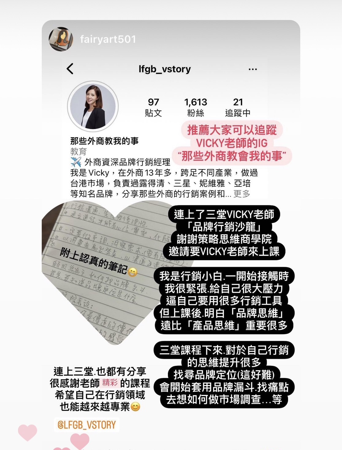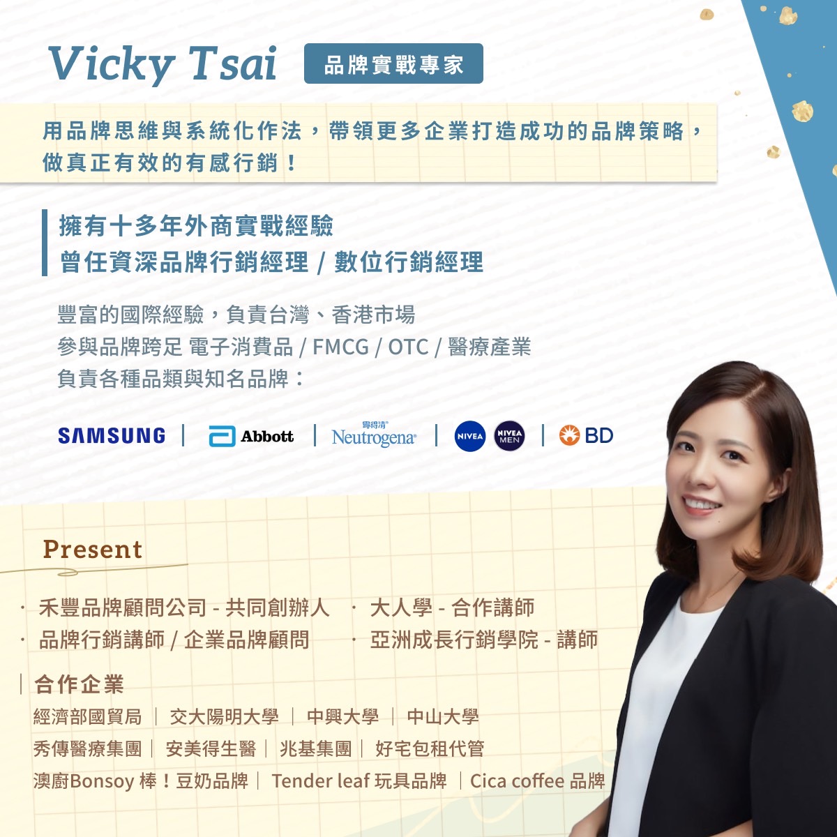 Vicky老師現為禾豐品牌顧問公司創辦人,同時也是企業講師/企業顧問。過去13年歷經5家外商公司,並跨足快速消費品產業、醫療產業、手機產業之品牌經理人。