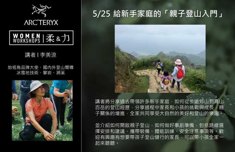 - 5/25(四) 19:00-21:00 【主題: 給新手家庭的「親子登山入門」】in 台北 ARC'TERYX信義旗艦門市4F / 台北市大安區信義路二段172號 (近捷運東門站5號出口)