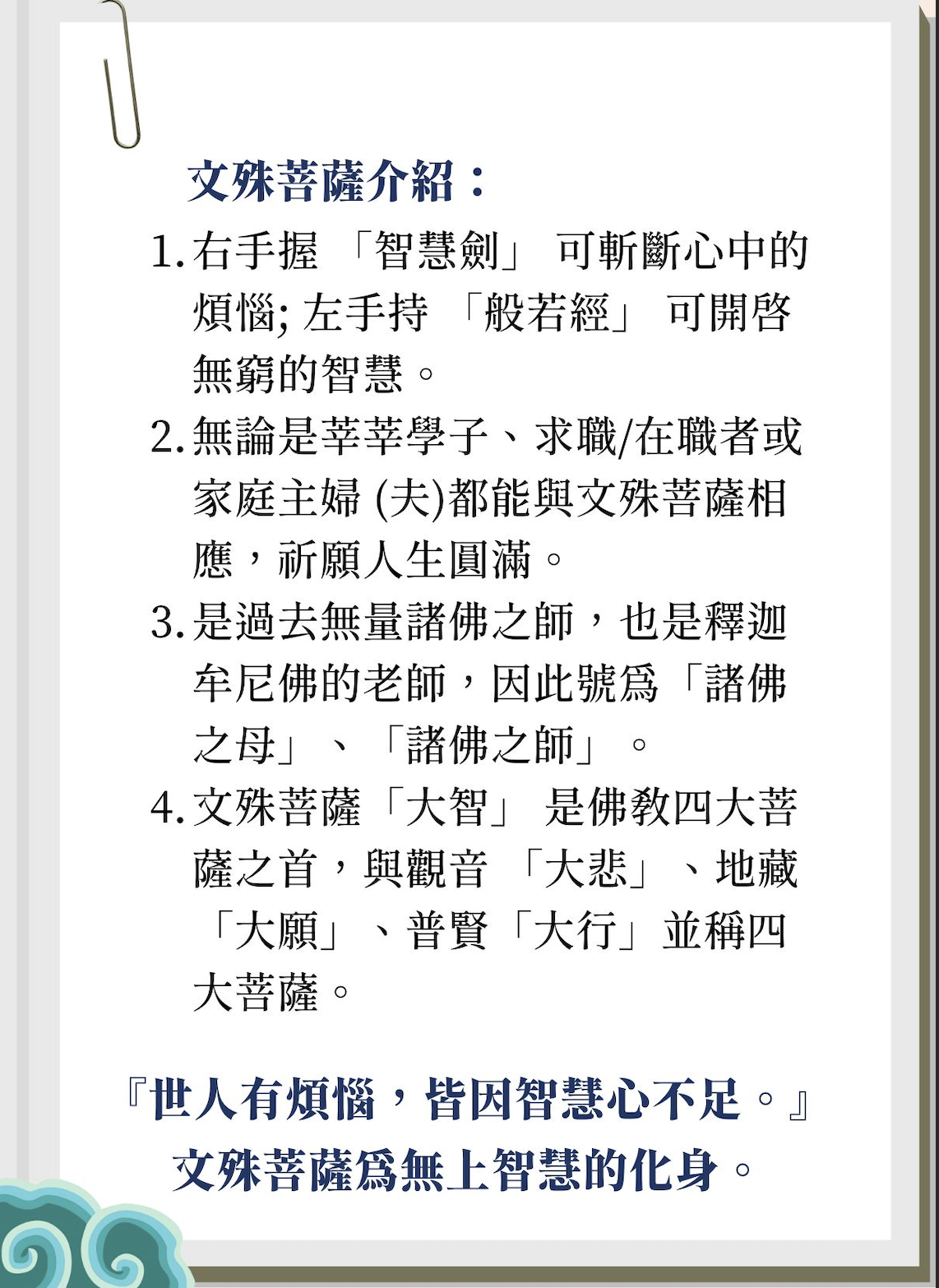 ▪️文殊菩薩,又名「智慧佛」,是佛教四大菩薩之首。代表聰明智慧,能以智慧斬除一切煩惱、業障等;在佛教經典中,乃以無礙辯才與大智慧著名,號為「諸佛之母」、「諸佛之師」。