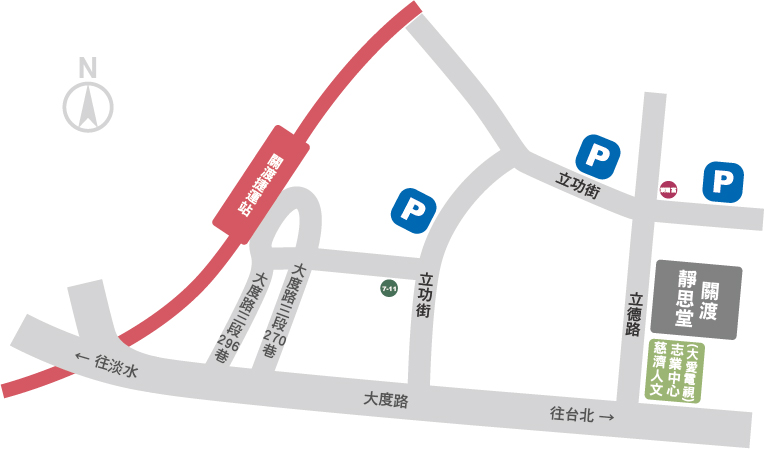 捷運關渡站 1 號出口(淡水線紅線),岀站後步行約 15 分鐘。