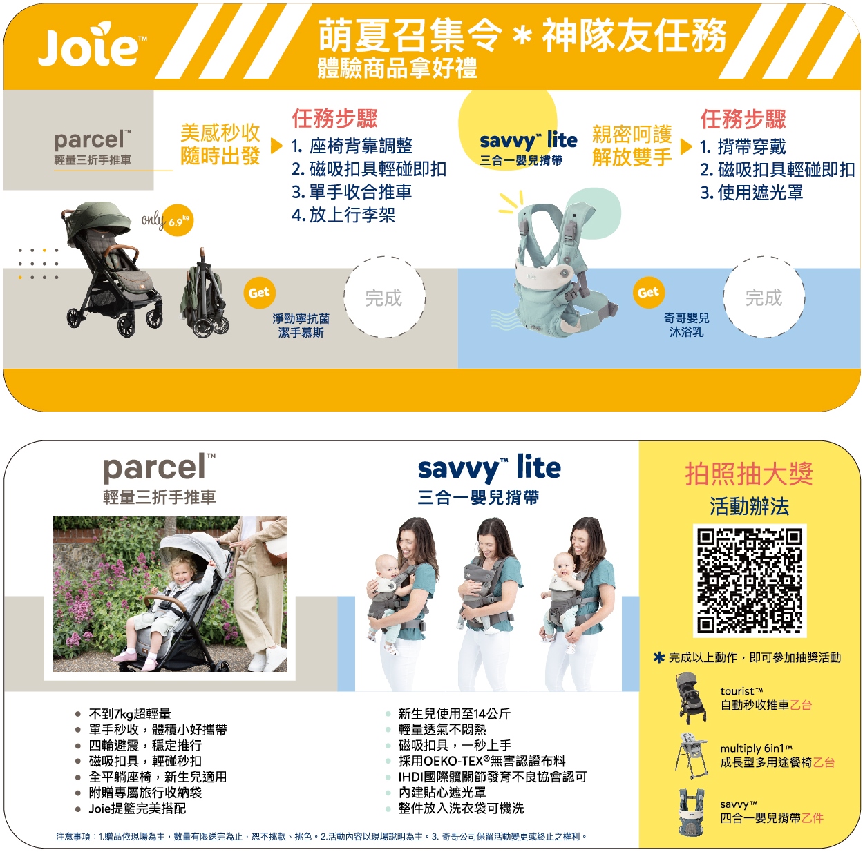 喜悅育兒首選品牌Joie,展開全台16場次【萌夏召集令】巡迴體驗活動,早鳥報名可享獨家好禮,現場參加「超神隊友-任務關卡」再送多重好禮!Joie年度新品非你體驗不可!就是要讓你這個夏天與神隊友一同喜悅育兒!