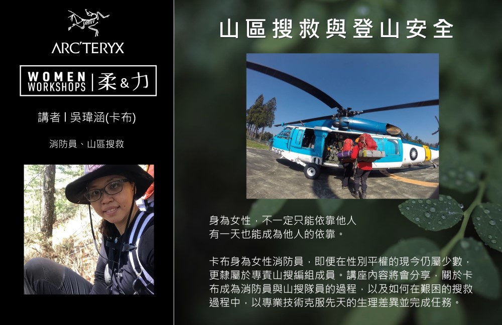 卡布身為女性消防員,即便在性別平權的現今仍屬少數,更隸屬於專責山搜編組成員。講座內容將會分享,關於卡布成為消防員與山搜隊員的過程,以及如何在艱困的搜救過程中,以專業技術克服先天的生理差異並完成任務。