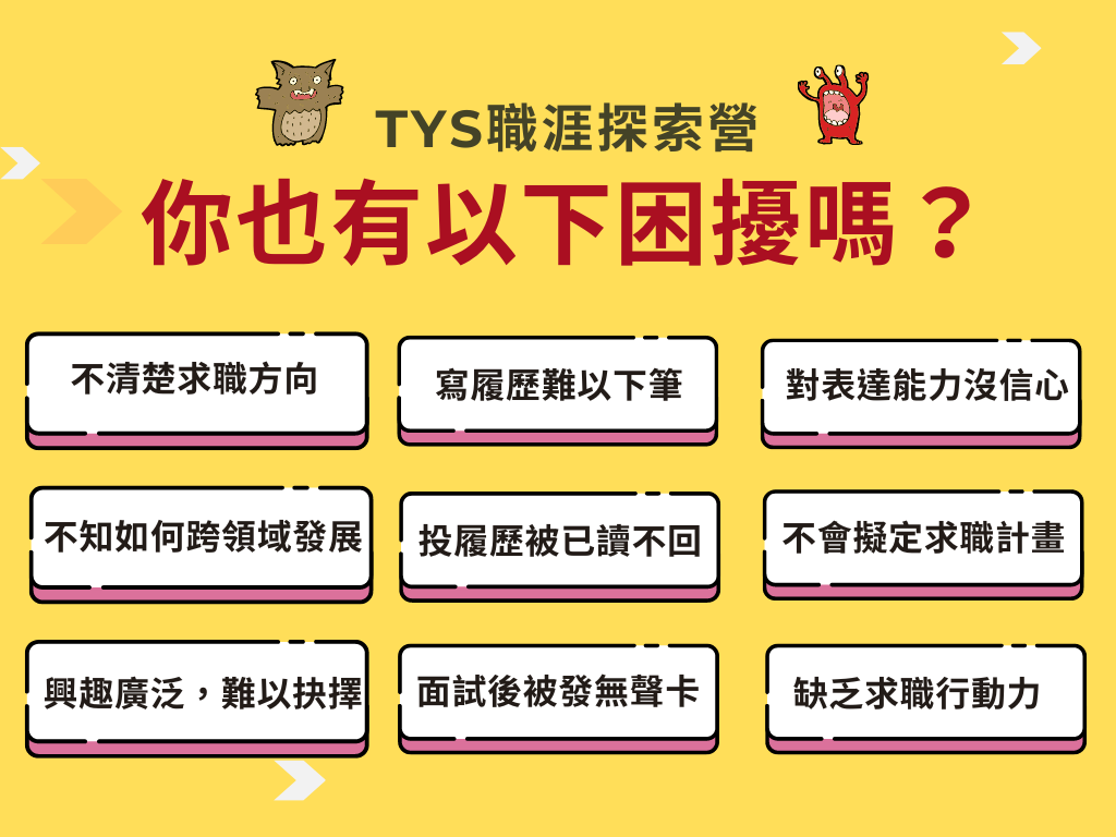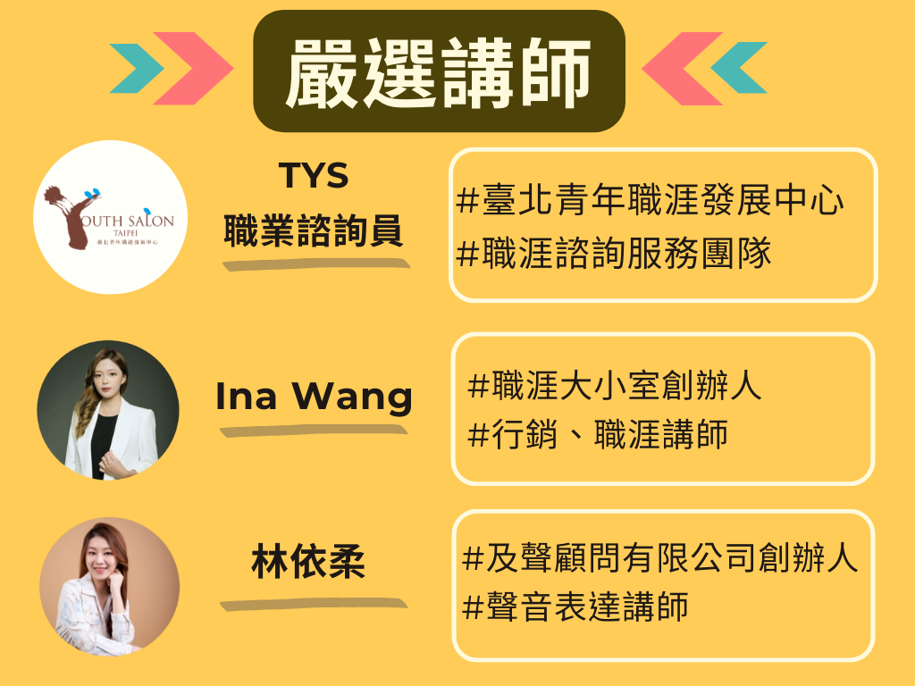 🔸授課講師:TYS職業諮詢員/王怡婷-職涯大小室創辦人/林依柔-及聲顧問有限公司創辦人