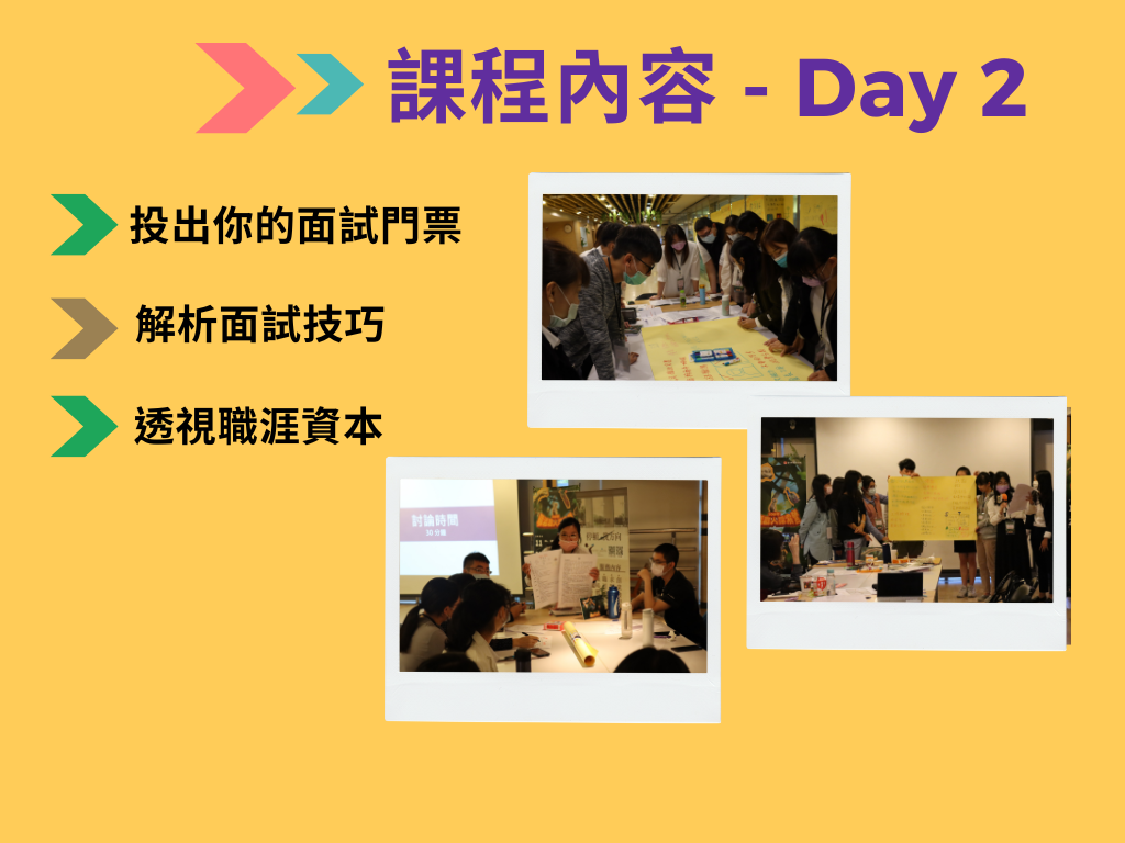 兩日探索-以求職面試技巧為主,搭配業界講師,帶給您最專業的職前準備及演練。