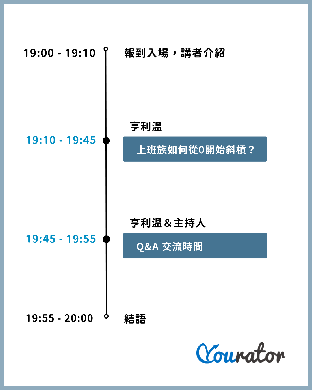 此次 【 Yourator 新世代職涯系列論壇】特別邀請到Instagram上有6萬人氣追蹤的斜槓專家 亨利溫 ,分享開啟斜槓的經驗,給予上班族實現斜槓生涯的勇氣與信心!分享他如何從0開始成為成功的斜槓工作者的經驗。