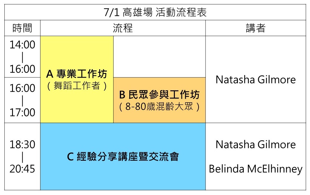 對象:一般大眾、藝文從業人員(舞蹈藝術工作者、藝術行政和管理者、社福機構和社區營造藝文活動企劃者等)