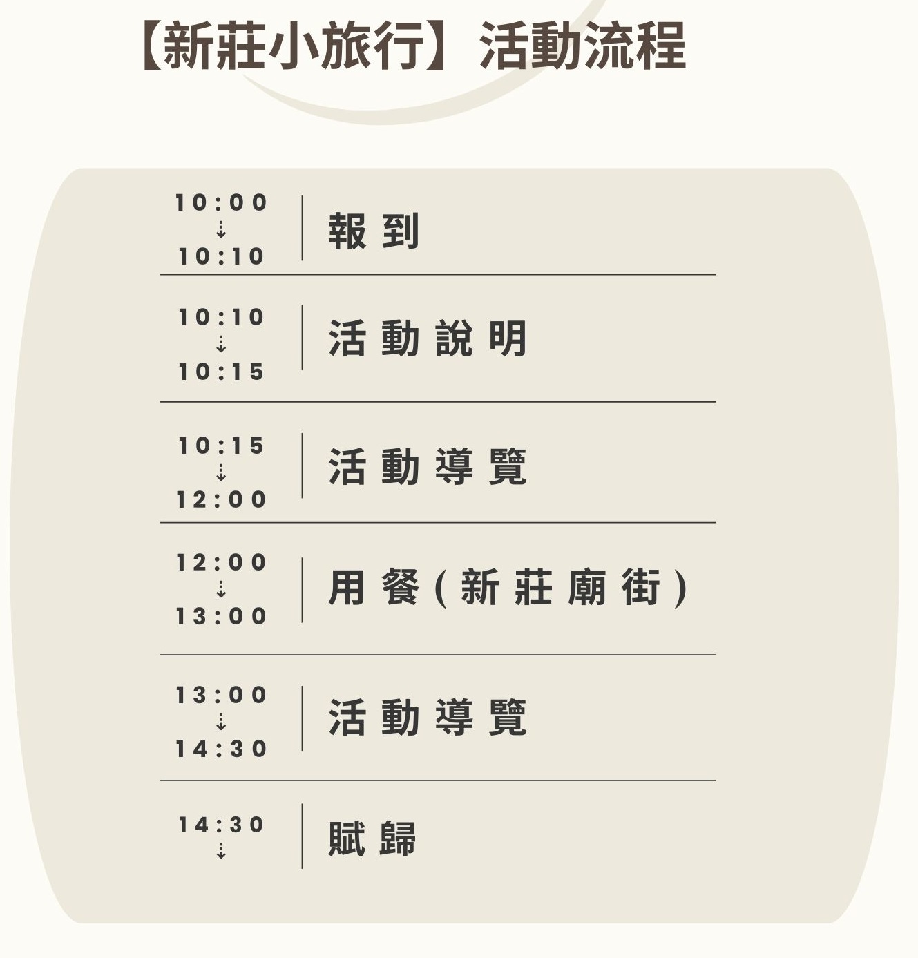 🚩路線安排: 捷運新莊站2號出口(集合)→响仁和鼓藝工坊→翁裕美商行→廣福宮 →文昌祠→慈祐宮→ 戲館巷→潮江寺→米市巷→林泉成古厝→挑水巷→武聖廟→日日用打鐵店→尤協豐豆干店→新莊廟街夜市(賦歸)