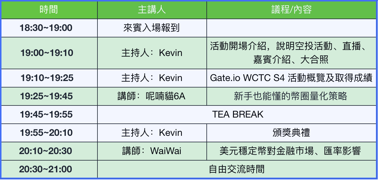 活動將於晚上7時至晚上9時舉行,註冊和入場時間為下午6時30分。 Gate.io 歡迎所有有興趣的人士參加,並參與圍繞台灣Web3、合約和量化市場發展以及金融未來的討論。