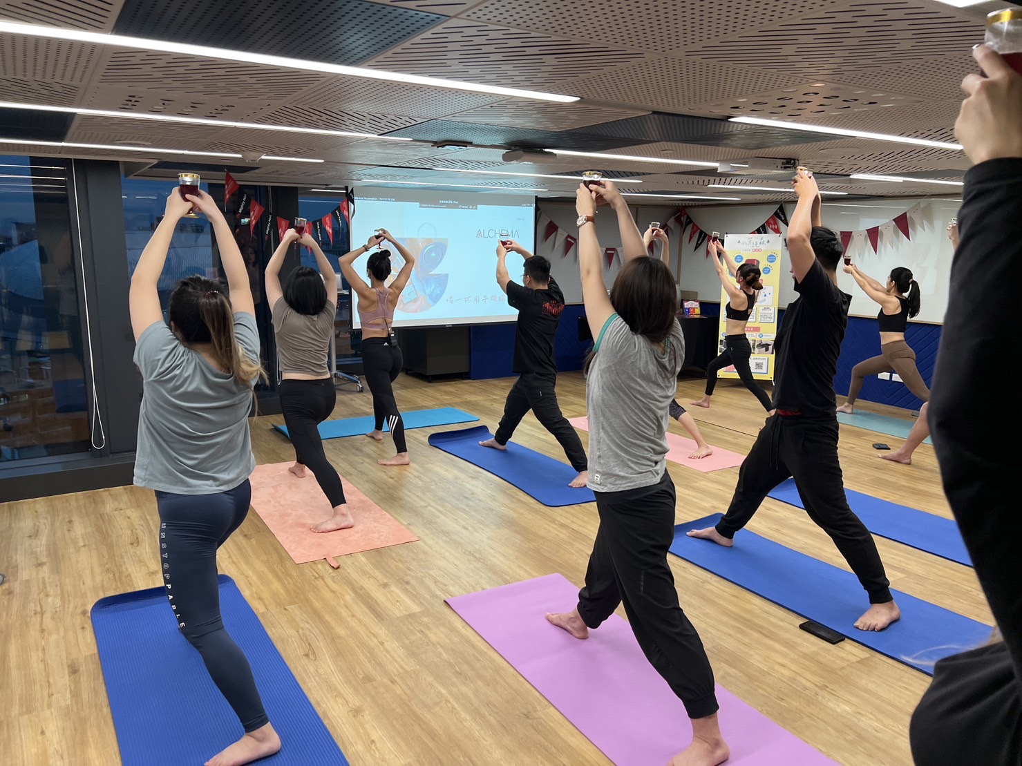 在瑜珈姿勢的變換中維持酒杯的平衡,潔淨的空氣中瀰漫舒服的精油香氛,在課程中專注於身心靈的感知,放下日常壓力,盡情享受周下班後的微醺時光。