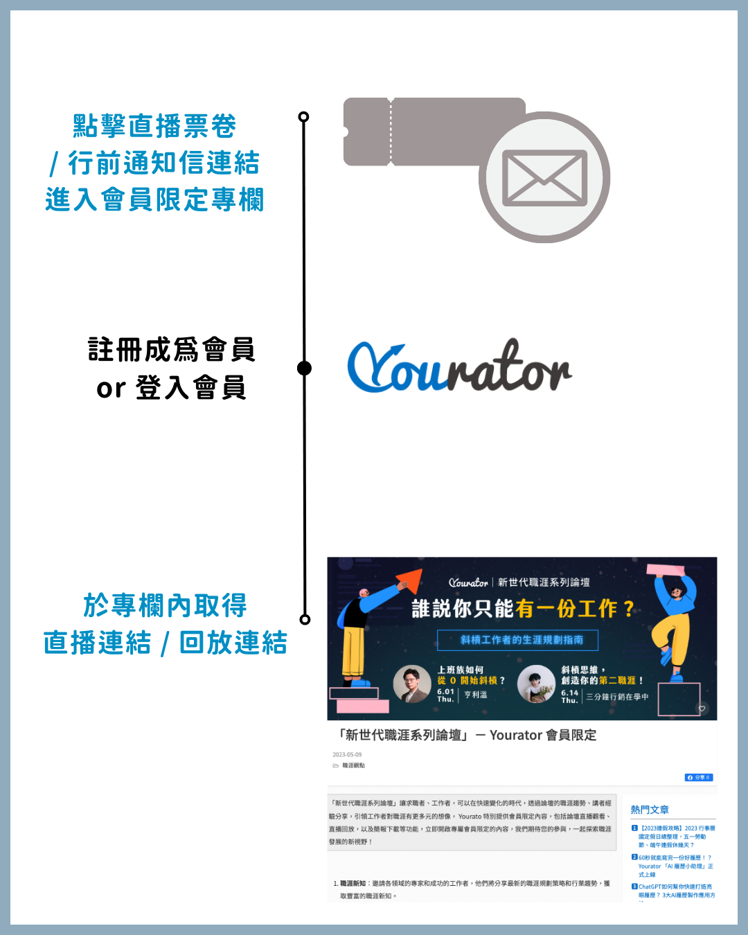 當天可以點擊 Accupass 票卷頁 / 行前通知信連結,會進入 Yourator 會員專區,登入後方可進入直播間,並取得回放連結與更多職涯活動資訊。