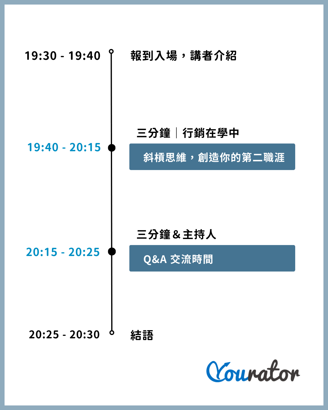 此次 【Yourator 新世代職涯系列論壇】特別邀請到 Instagram 上有 5 萬人氣追蹤的「三分鐘|行銷在學中」 ,分享職場新鮮人或行銷背景的工作者,如何運用斜槓思維,成功創造出自己的第二職涯,打造成功個人品牌!