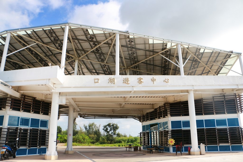 口湖遊客服務中心,為口湖地區濕地生態園區的節點之一,以濕地間常見物為意象,水鳥振翅飛舞的美麗景象為設計構想,在周圍空曠的草皮地景掀開波瀾。
