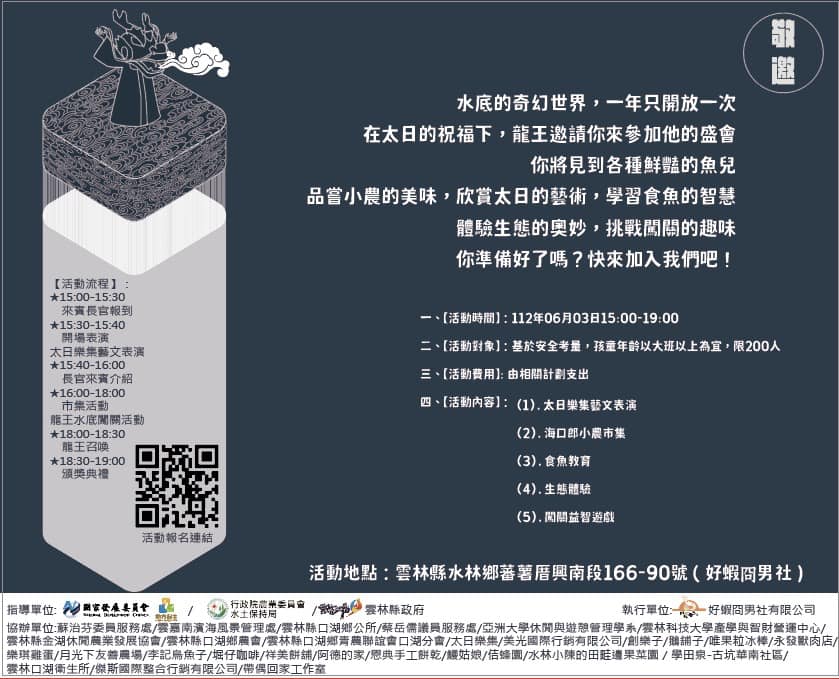 一個很蝦的故事,池塘養殖養出無毒鮮甜蝦,來到口湖想吃點海鮮料理,那來好蝦冏男就對了。「龍王的召喚」 水底的奇幻世界,一年只開放一次。重蝦禮聘,一輩子一定要聽一次的太日樂集。「雲林沙漠的驕傲」 在來自各地的祝福之下,龍王邀請你來參加他的盛會。 你將見到各種鮮豔的魚兒,品嘗小農的美味,欣賞太日的藝術,學習食魚的智慧,體驗生態的奧妙,挑戰闖關的趣味。 你準備好了嗎?快來加入我們吧!