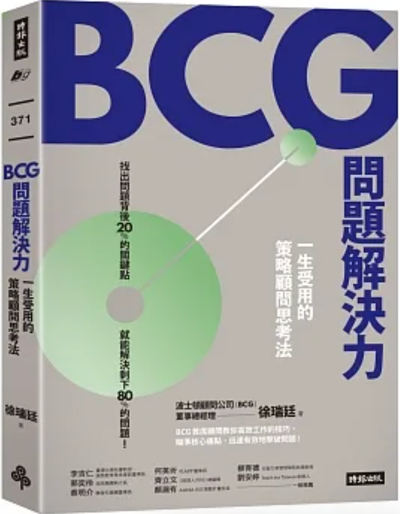 找出問題背後20%的關鍵點,就能解決剩下80%的問題? 波士頓顧問公司(The Boston Consulting Group,BCG)為全球領先的管理顧問公司,客戶遍及財星500大企業與政府單位,本書由BCG首席顧問撰寫,我將帶領你運用書中高效工作的技巧,瞄準核心痛點,迅速有效地擊破問題!