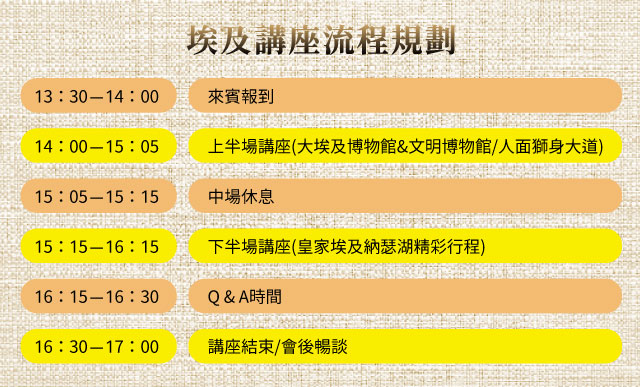 皇家特邀他於6/10舉辦專題講座,深入淺出介紹預計於11月開幕、眾所期待的「大埃及博物館」、2021年開幕的「文明博物館」,以及甫於2021年盛大重啟的「公羊之路人面獅身大道/公羊之路」等最新資訊,下半場則將分享「埃及納瑟湖之旅」的箇中精彩,稀有講師、機會難得,歡迎各位皇家貴賓踴躍報名!(現場備有簡單茶水,歡迎享用)