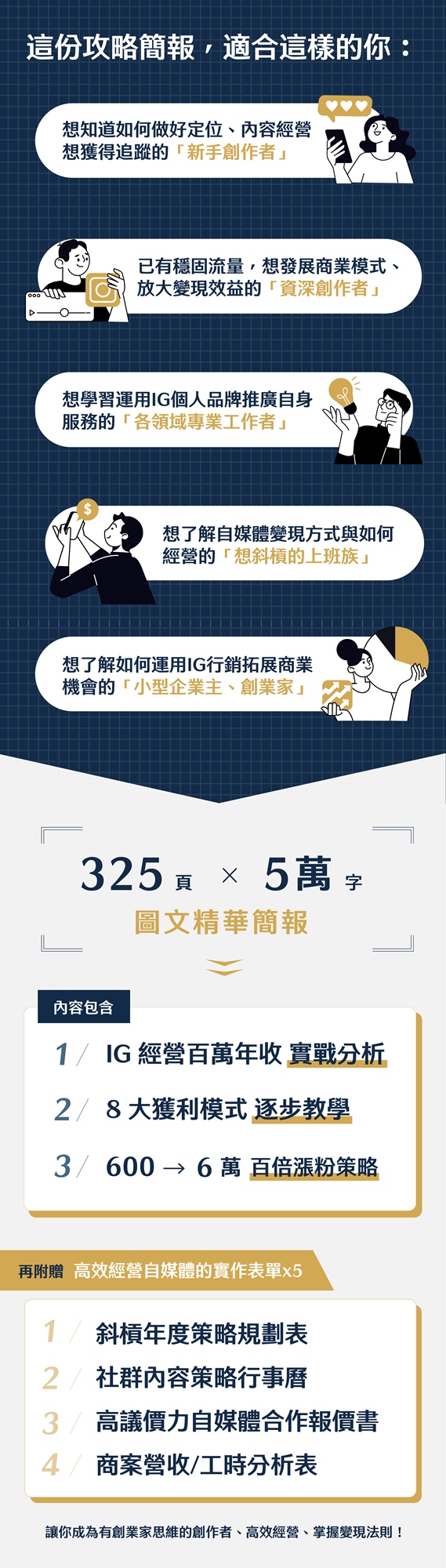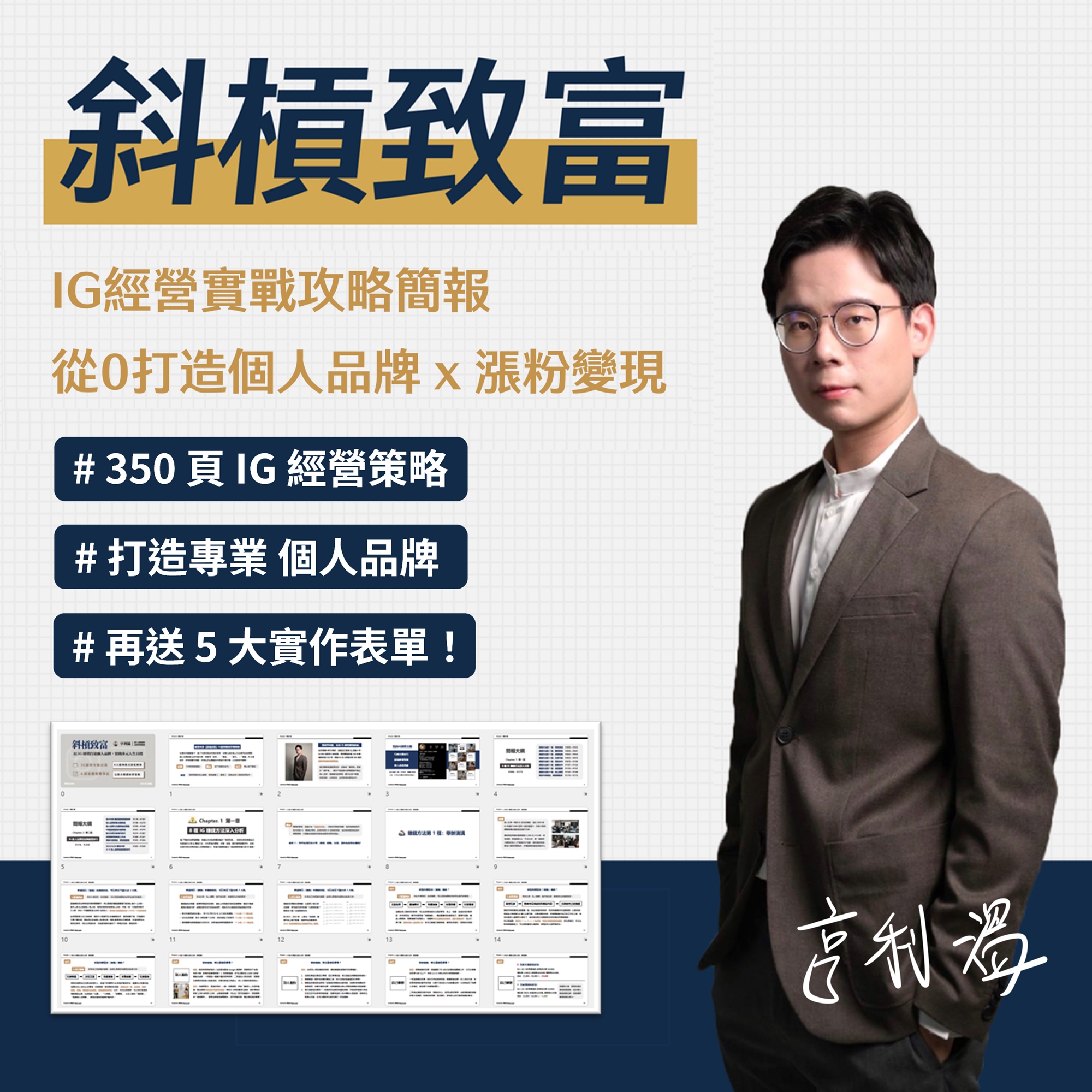 這個IG經營課程,並非傳統的影像視訊,而是一份集結大量圖文精華,高含金量的實戰簡報檔案,簡報中一共有 325 頁,5萬字左右的內容,精華整理我過去100多場演講的教學,和IG經營3年半,從600到6萬追蹤的實戰紀錄,包含:品牌定位、內容寫作技巧、漲粉策略,以及最重要的用IG增加收入 8 大必學秘訣!