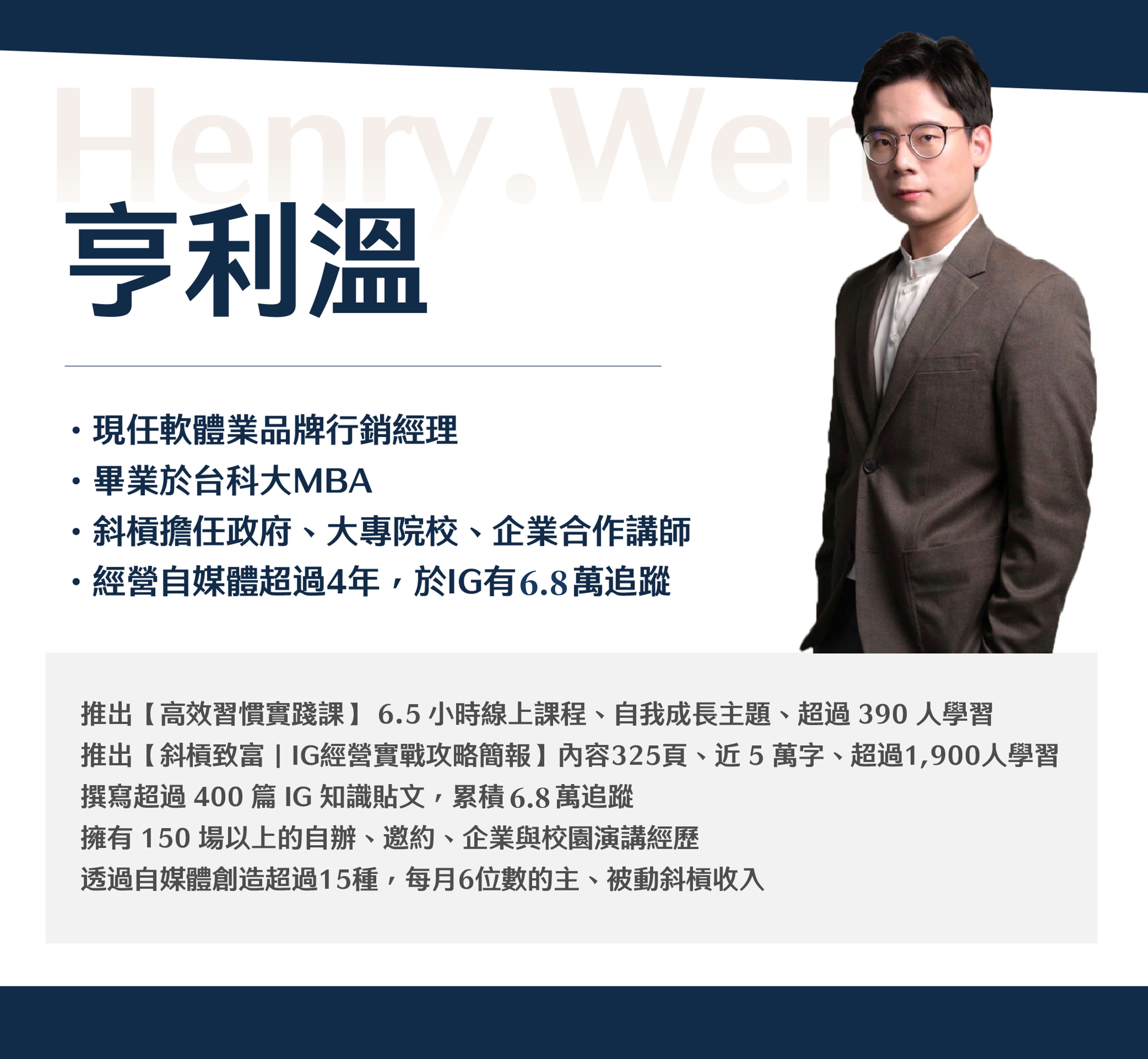 哈囉你好,我是亨利溫。白天的正職是軟體業的品牌行銷經理,下班後的斜槓身分是,在IG上有6.8萬追蹤的知識型創作者,並身兼個人品牌經營顧問、高效習慣教練、大專院校與政府單位合作講師,幫助我的讀者、學員,運用自媒體有效實踐自我成長、打造個人品牌,賺取多元的斜槓收入!